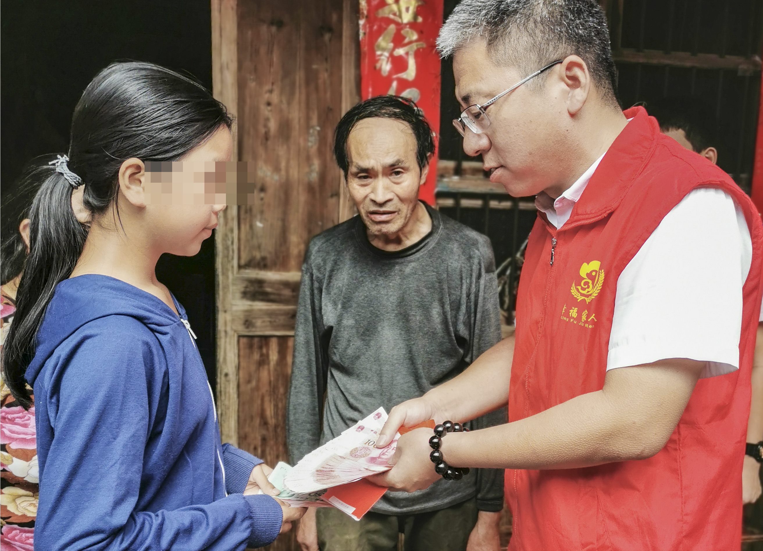 近日,在磐安县仁川镇滚涛村,市区幸福家人公益组织志愿者将爱心助学金送给学生李某,鼓励她好好学习,今后会帮助她顺利完成学业。