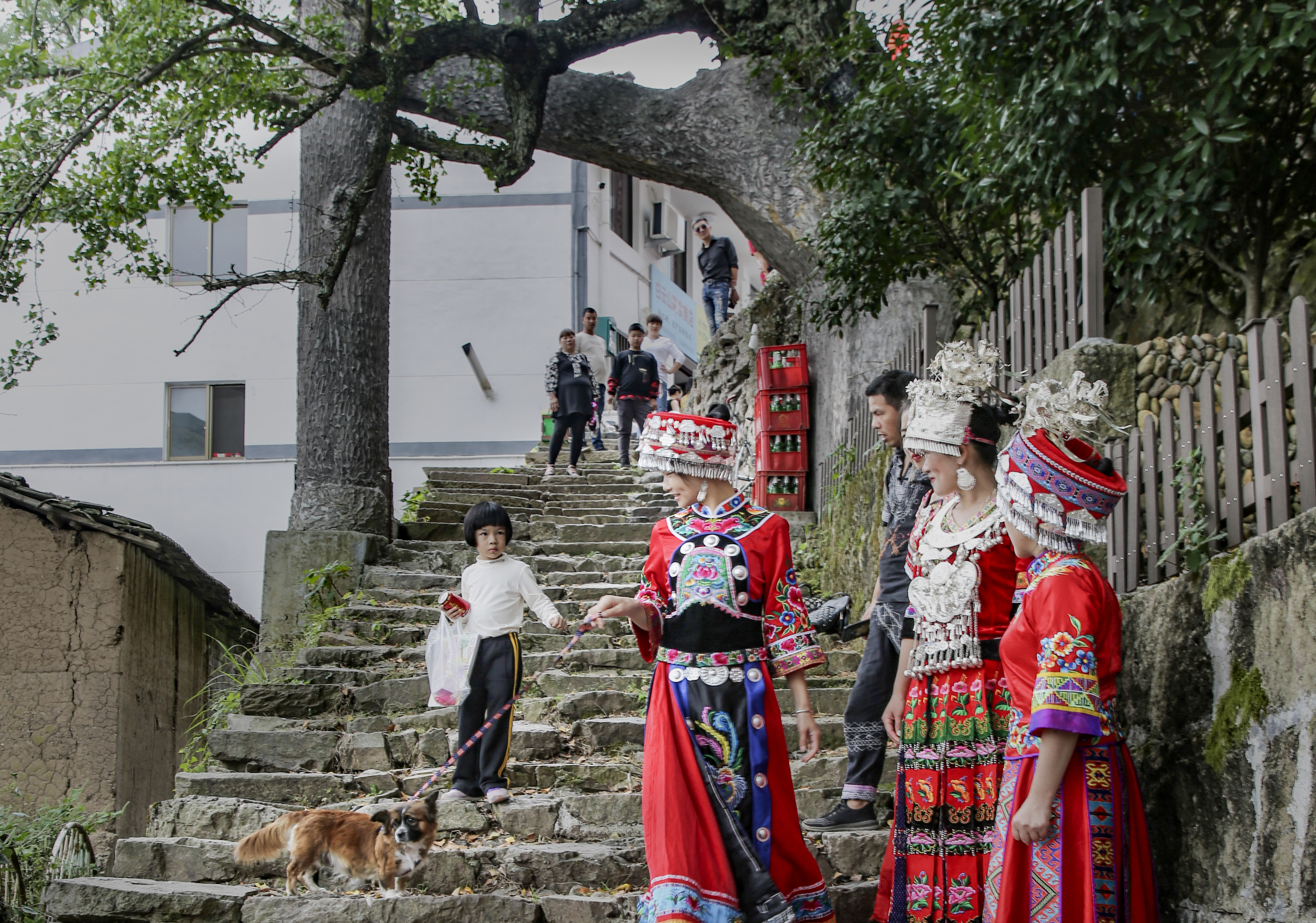 今天,磐安县安文街道白云山村,穿着少数民簇风格服饰的女孩在古树下吸引游人拍照。