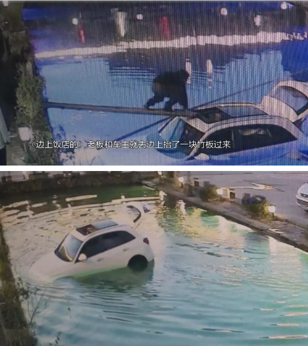 村民朱玉堂说,(边上饭店的)老板和车主就去边上抬了一块竹板过来,我就在边上拿了一根竹竿过来,将竹板搭在车上面。车主就用竹竿当扶手往里面走,在天窗里面将狗救出来了。贾先生说,车子冲下去之后,村民们都来帮忙,把狗救了出来,十分感谢。