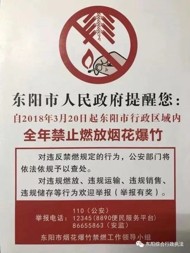 烟花爆竹燃放不仅会污染大气,还会在短时间内产生大量噪音影响居民生活,在城区和人员密集区极易引起火灾和伤人事故。在此,东阳市综合行政执法局再次提醒市民,不要抱有侥幸心理,违反禁燃规定的人将受到法律的严厉制裁。