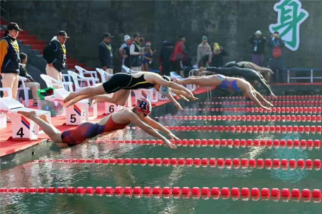 12月15日上午,第九届浙江省冬泳锦标赛暨首届浙江省公开水域冬泳锦标赛在磐安县方前镇始丰溪开幕,“洪荒少女”傅园慧前来助阵。这是我省首次在户外公开水域举行冬泳赛,全省21支代表队、600多位运动员参赛。