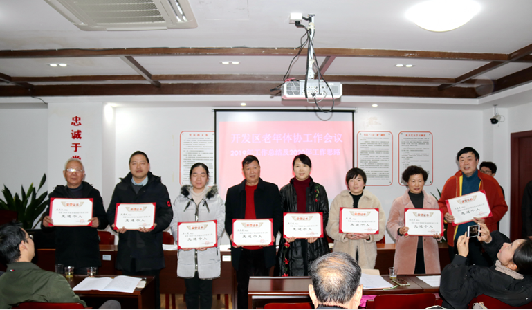 在会议上,各乡镇(街道)老年体协还进行了工作交流,并对汤溪镇老年人体育协会等5家开发区老年人体育协会先进集体和苏孟乡徐心悦、张珍等17名先进个人进行了表彰。张均明副主席希望受表彰的单位和个人,继续发扬成绩,再接再励,珍惜荣誉,在新的一年里取得更大的成绩;也希望各单位要以先进为榜样,认真部署2020年老年体育中心工作、重点工作,积极进取,努力工作,为推进新形势下我区老年体育事业发展作出更大的贡献。