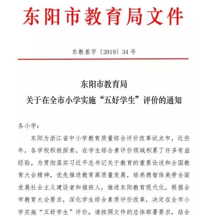去年下半年,东阳在全市小学实施“五好学生”评价,在处理德与才的关系,全面落实立德树人根本任务方面,在全省率先开展探索。10月,省教育厅党委书记、厅长陈根芳作出批示肯定。