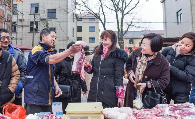 刘春财家的展位前熙熙攘攘围了一堆人,他家的年猪、家禽用传统方法喂养,长得慢,一年只出一批,因此格外抢手。峰边自然村村民刘胜云喜滋滋地说,她从朋友圈里看到这里有年货节,她一口气买了700多块钱的土猪肉,专门挑脊部肥瘦均衡的肉,自己吃、送人都很好。