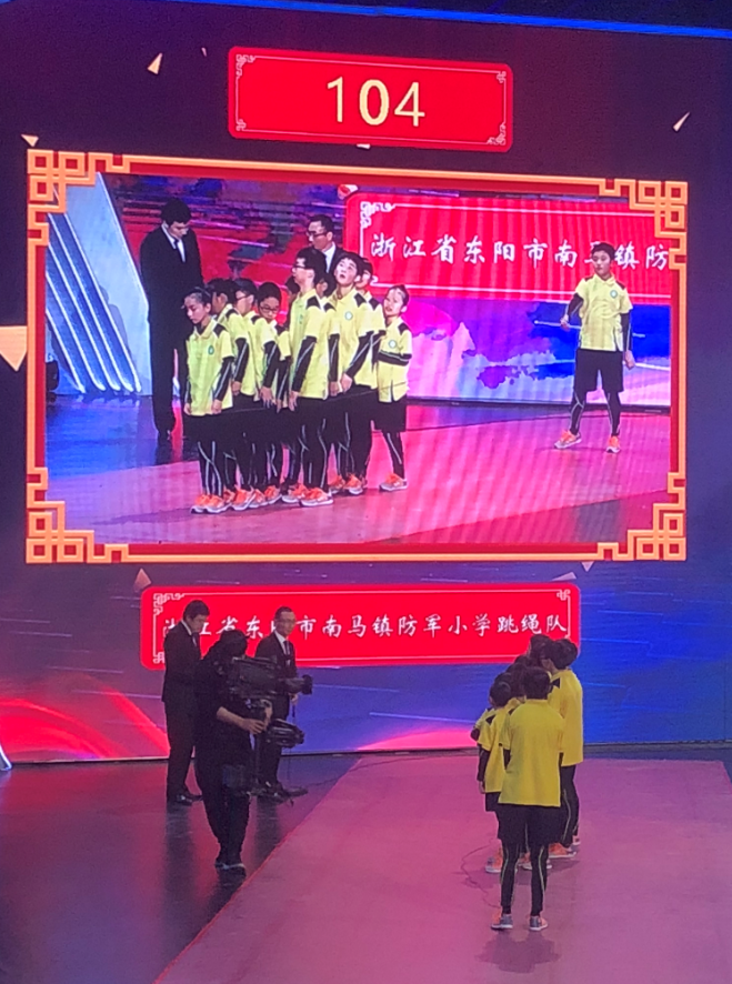 两名摇绳者快速摇绳,10名跳绳者双脚快速点地,十人如一,短短30秒却紧张刺激,不禁令人屏住呼吸。1月25日下午3时多,中央电视台《挑战不可能新春盛典》节目中出现了东阳市南马镇防军小学学生的身影。该校12名学生身着黄色“战服”参加快速跳绳项目挑战。