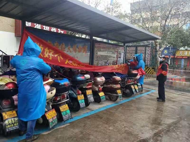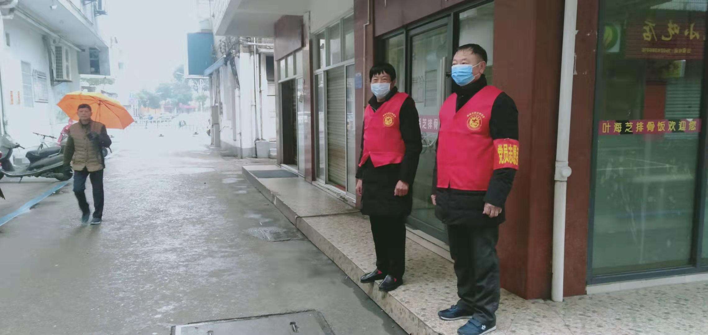 1月28日,两批党员志愿者正式上岗。他们冒着寒风冷雨在社区内主干道站岗值班,劝阻外来车辆进入社区,向来往的居民宣传疫情防控的相关知识,悬挂疫情防控横幅。