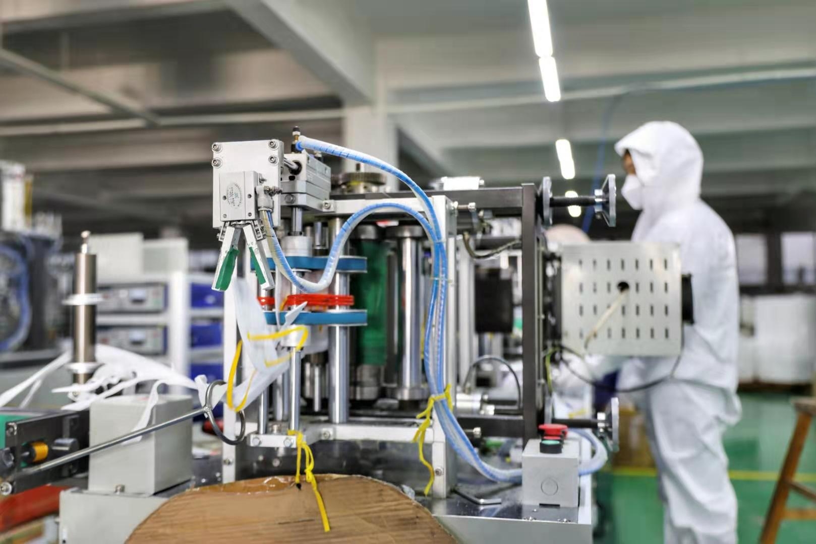 初一上午,召集工人返岗开展培训、协调技术人员、选取库存原材料,下午紧锣密鼓组装模具、调试生产线,3点设备调试完成,没几分钟首批口罩下线。“目前15名骨干员工采取白班+晚班的模式倒换调配,保证一天24小时不间断运转。”老金自己则负责生产线的巡查维修,24小时“宅”在了厂里,饿了煮点面条,困了睡行军床……