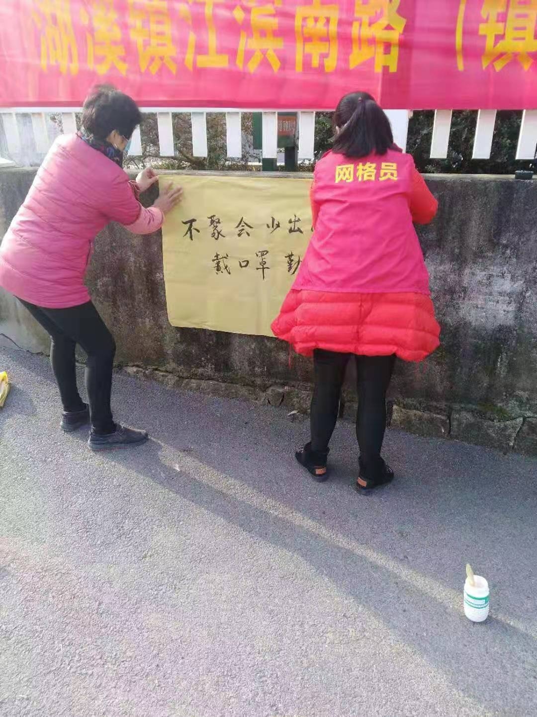 “今天到处串门 明天肺炎上门”“串门就是互相残杀 聚会就是自寻短见”……湖溪村的女同志们利用大字报、横幅宣传防疫,并拖着移动音箱对村民们隔空喊话。在做好宣传发动的同时,她们还热心指导老年人戴好口罩防护自身安全。
