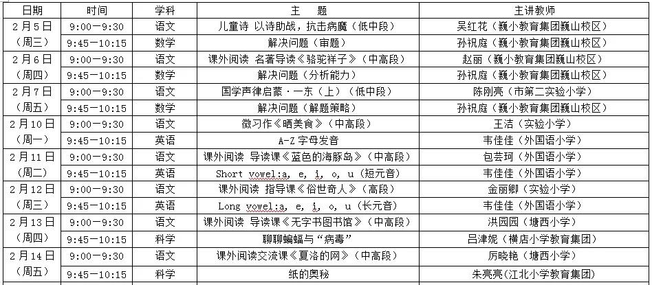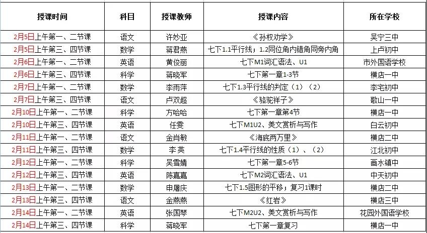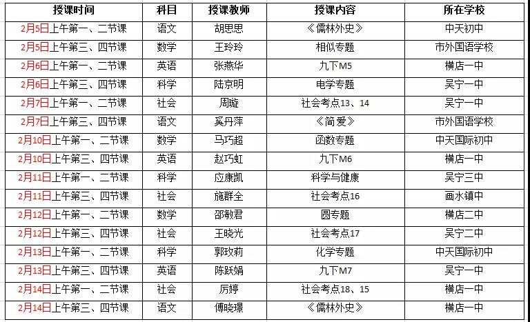 其实,东阳开设公益网络课堂已有7年,2016年起将其常态化,每年暑假、寒假、中考前为初中生开设。新型冠状病毒感染的肺炎疫情让这个寒假变得特殊,东阳市教育局及时调整“课程表”,2月5—14日,初中段调整为每天上午4节课,科目包括语文、数学、英语、科学,课程内容更加丰富。并且,5日起,东阳市教育局将新增小学段名师网络公益课堂,一直持续至21日(周六、周日休息)。
