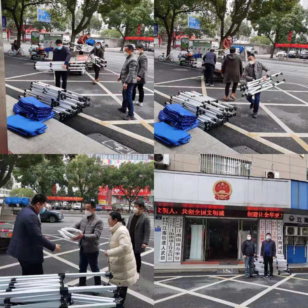 婺城区人大代表、浙江海悦绿建科技有限公司总经理刘兴财发现卡口执勤的工作人员24小时轮班值守,已经非常辛苦了,还要吹风受寒,当即订了10顶帐篷送到街道各个卡口装好,为一线执勤人员挡风取暖。