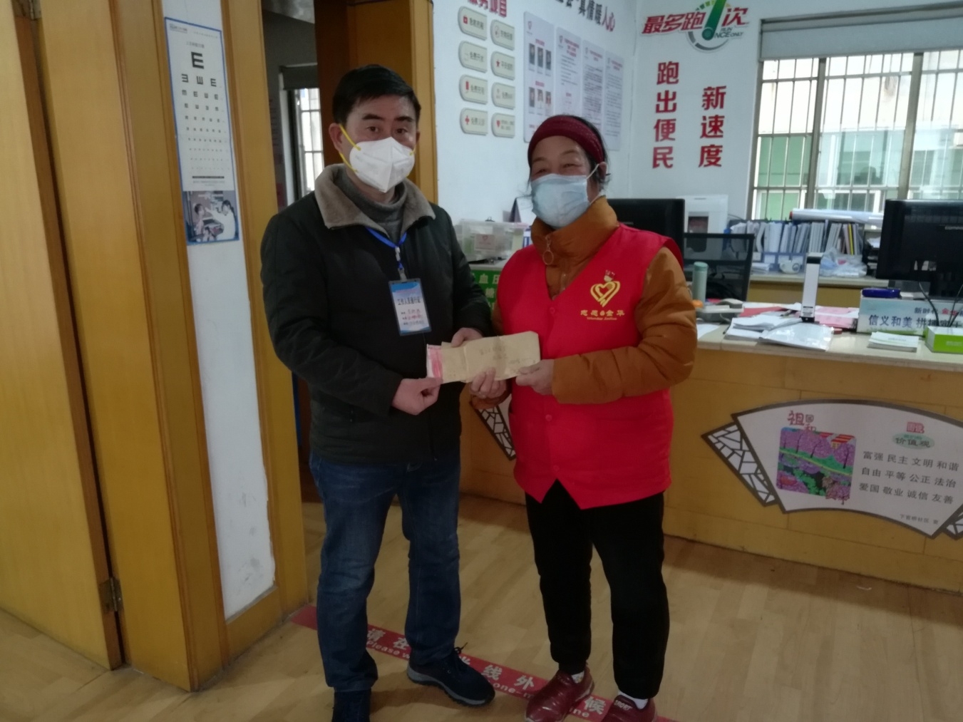 2月3日下午,江南街道下官桥社区办公室来了一位身穿红马甲的志愿者,冻得通红的双手紧紧捏着一个已经揉皱的黄色信封。“李书记在吗?”她问。刚结束巡查工作的社区党委书记李驰波听到询问立马走上前去:“韩丽梅同志,怎么了?”
