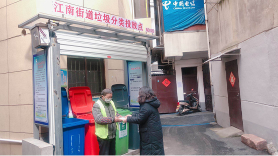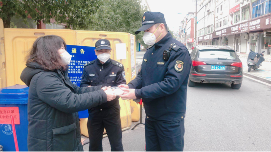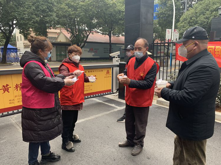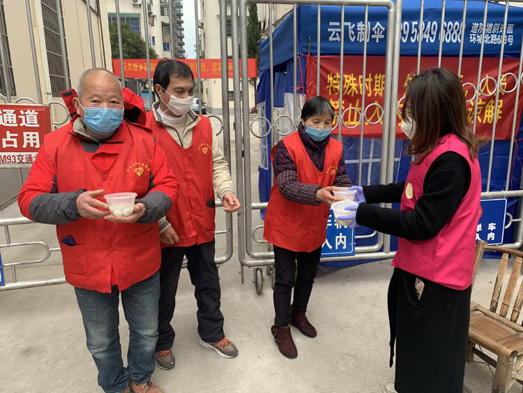 高畈社区党委书记唐淑丹一行将一碗碗甜甜的汤圆送到坚守岗位的每一位工作人员、志愿者、垃圾分拣员,以及隔离在家的居民手中,让大家在特殊时期的元宵节里同样能感受到暖暖的温情。
