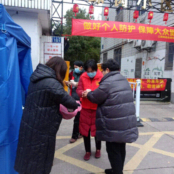 同样的场景也发生在金钱寺社区。江南街道党政办主任丁德胜、金钱寺社区党委书记胡芳一行带着亲手煮好的汤圆,前往慰问各个卡点的志愿者。在这特殊的日子里,每个人都在舍小家、为大家,贡献着自己的力量,众志成城防控疫情。