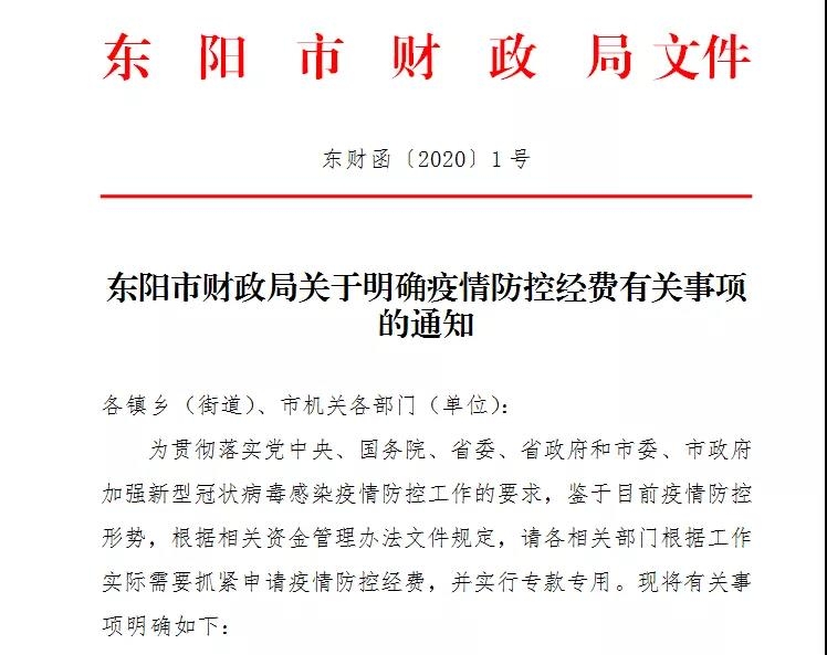 此外,东阳市财政局第一时间落实省领导关于防控工作“量化细化闭环管控”的工作要求,下发《东阳市财政局关于明确疫情防控经费有关事项的通知》,明确疫情防控经费实行专款专用,不得挤占挪用救灾防疫资金。严禁“搭车”用于与疫情防控无关的支出,不得借机违规发放各项津补贴和福利,如有违反的,一经查实,追究相关人员责任。