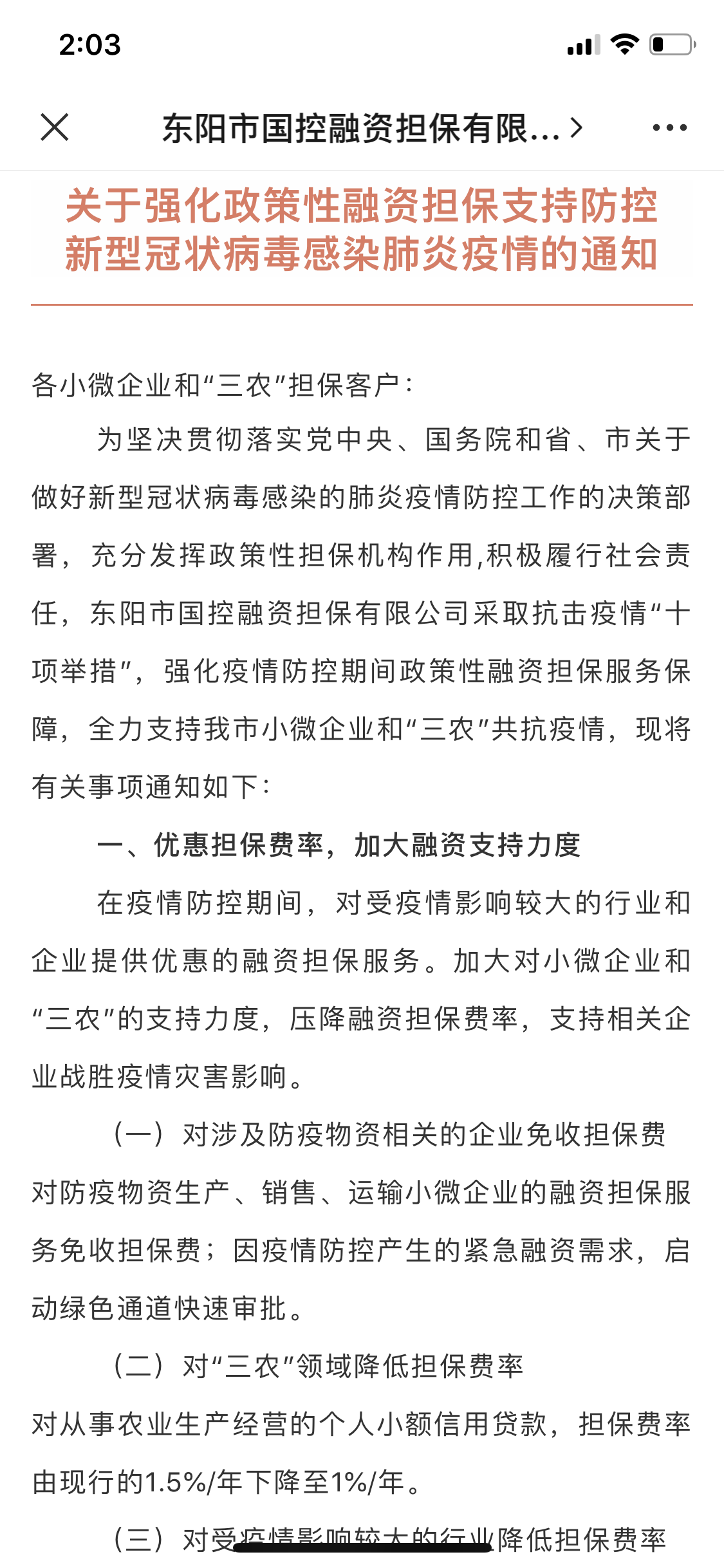 2月12日,记者从东阳市财政局了解到,为充分发挥政策性担保机构作用,积极履行社会责任,东阳市国控融资担保有限公司采取抗击疫情“十项举措”,强化疫情防控期间政策性融资担保服务保障,全力支持东阳市小微企业和“三农”共抗疫情。