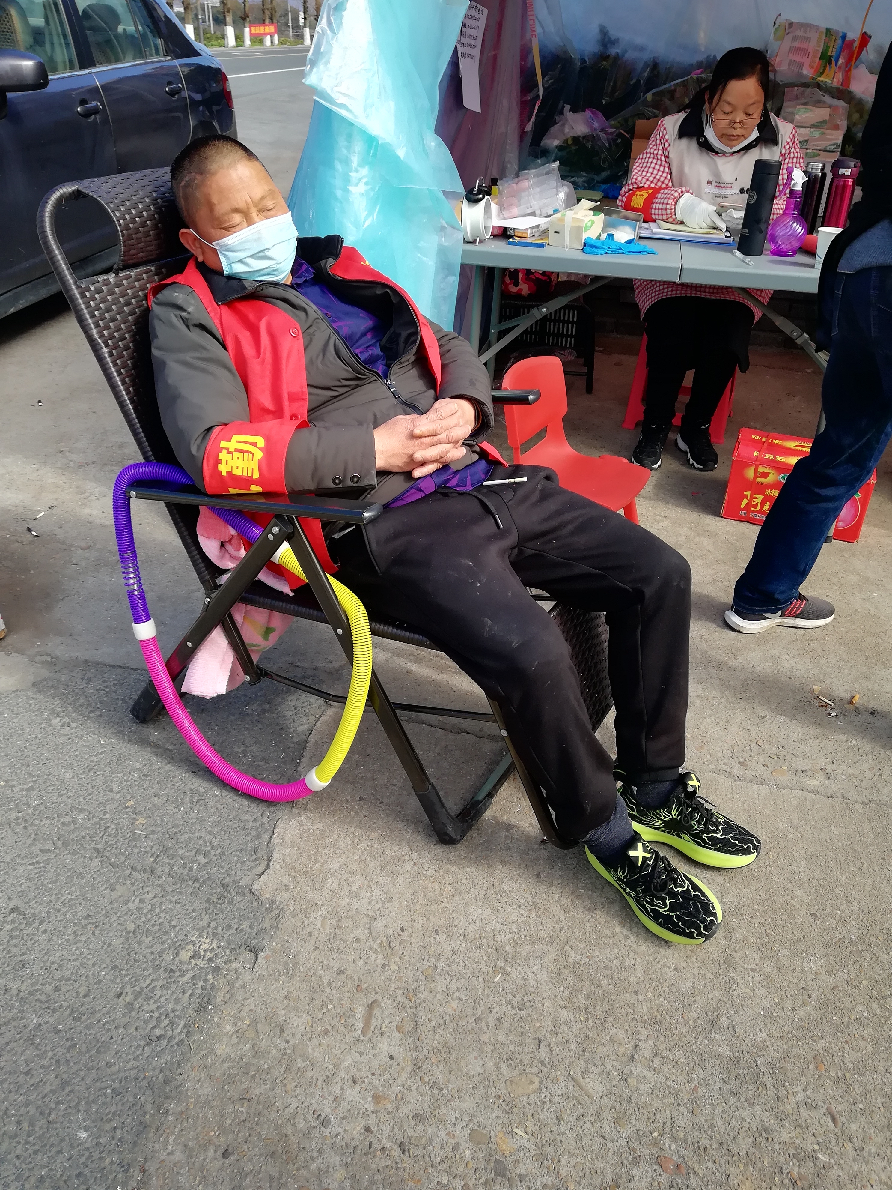 “实在太困了,坐在椅子上就睡着了。”2月14日上午,在东阳市虎鹿镇白峰村监督委员会主任胡希乐给村民送完代买的物资后,趁着值勤人手充足的空挡,眯了一会儿。