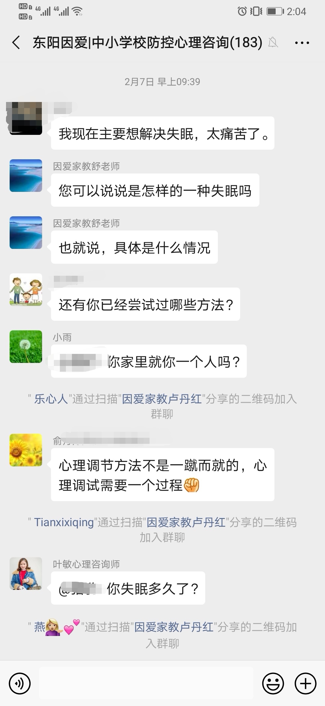 公益群内的心理咨询师,既有东阳心理健康教育骨干教师,也有来自因爱家庭教育引航站的志愿者。每天,群内有4名心理咨询师值班,为咨询者进行心理疏导,有在家办公,拖延症发作,工作效率不高而郁闷的;有刚刚做电商的21岁小伙子,待在家中没有收入,觉得好累好难的;有小学生出现头晕、睡觉不踏实等情况,还会出现不自觉深呼吸的……有些疏导案例需要花费两三个小时甚至更久,但咨询师都耐心对待。
