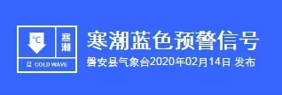 磐安气象台2月14日16时43分发布寒潮蓝色预警信号: 15日下午起,受强冷空气影响,磐安有一次寒潮天气过程,将出现强降温、风力增大和雨雪天气,预计日平均气温过程降温幅度可达10~12℃,过程最大风力5~7级,高海拔山区7~8级。
