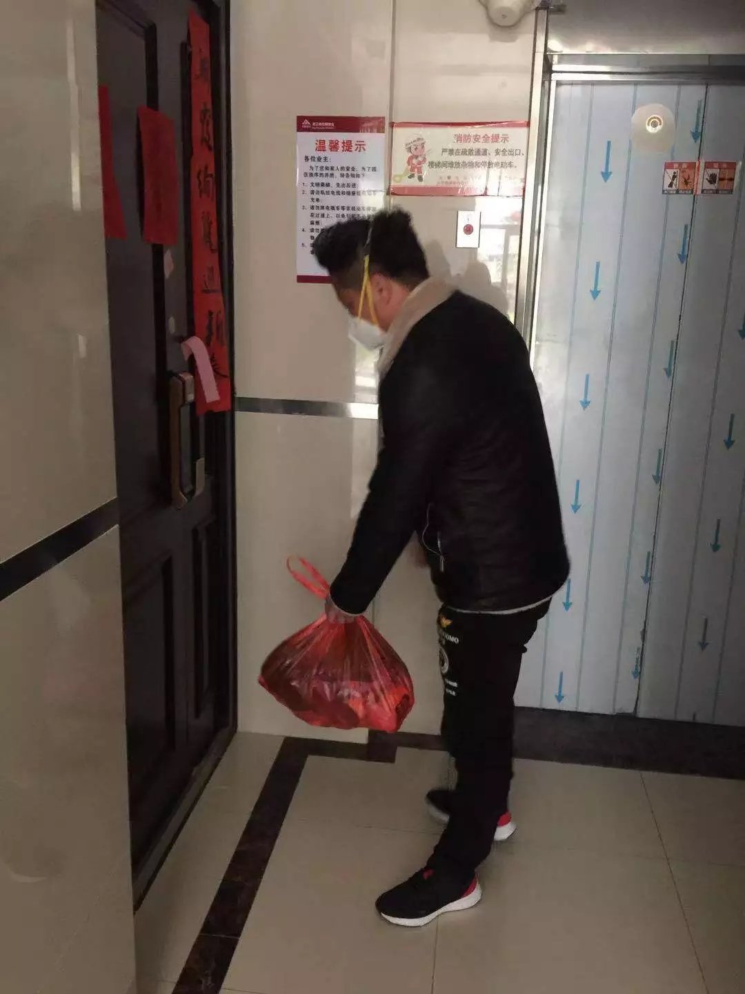“您好,这是您要的蔬菜和水果,放在门口了。”社区工作人员章中山上门为居家隔离居民送上他们点单的蔬菜和水果,临走时还带走了他们的生活垃圾。“居家隔离是为了隔离病毒,但不能隔离爱与关怀,居民不能出门,我们就送上门!”章中山说。
