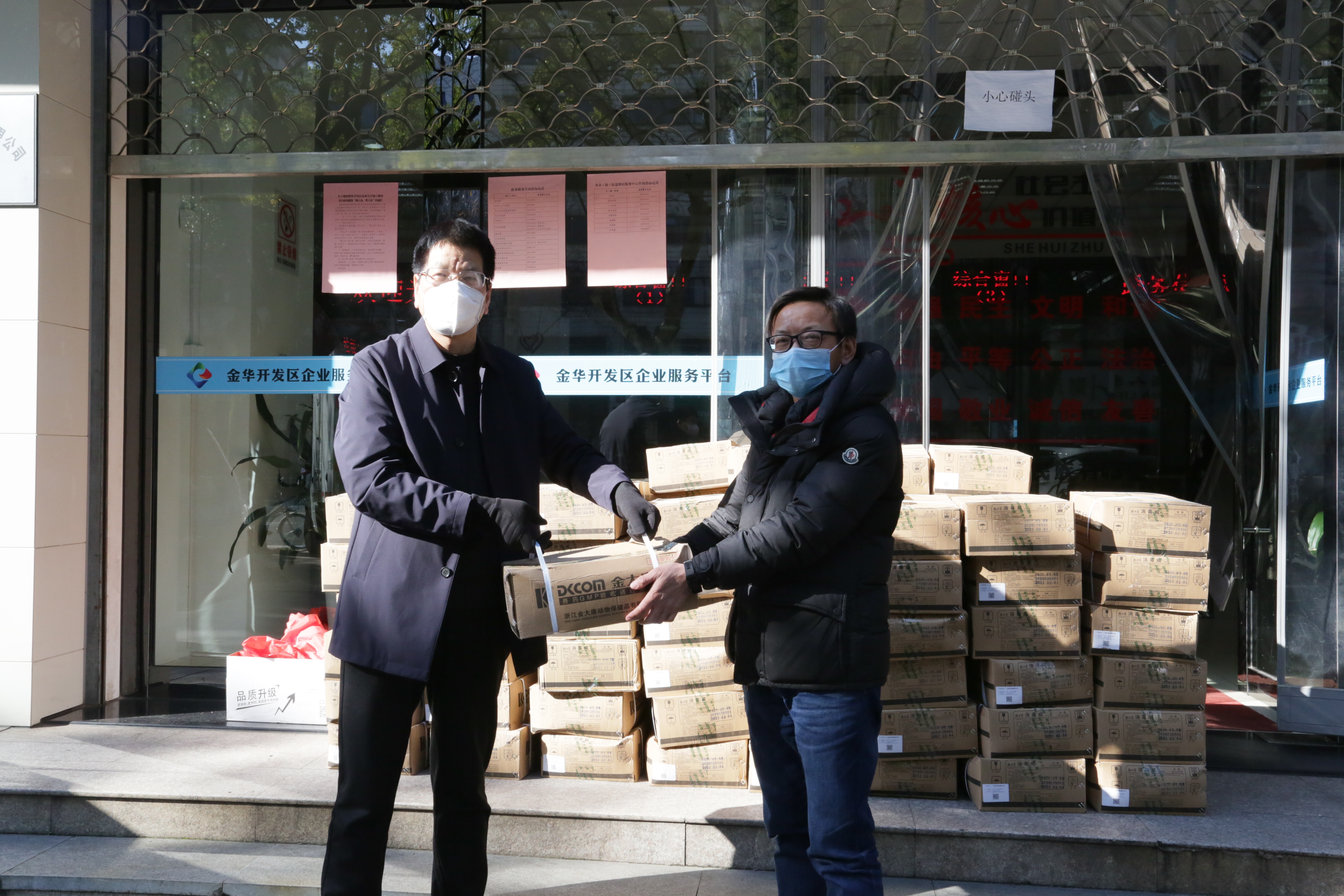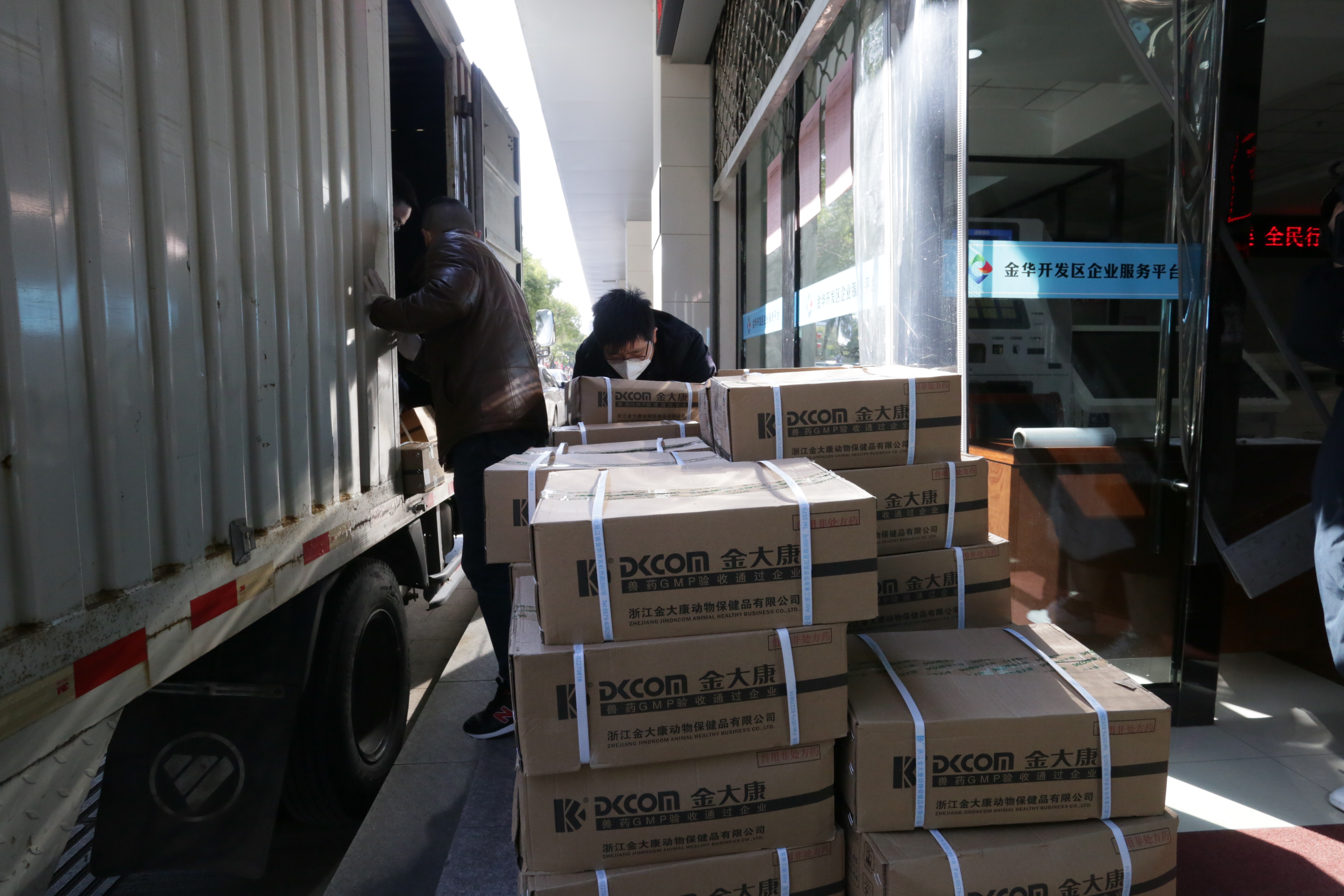 2月17日下午,浙江金大康动物保健品有限公司董事长缪雪荣给开发区送来了1吨含氯消毒粉。根据1:400或1:500的兑水比例,这些消毒粉可制兑成400~500吨消毒液。