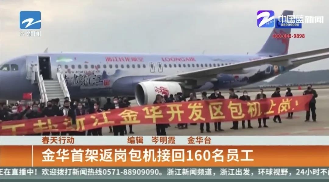 2月22日,浙江卫视播出《金华首架返岗包机接回160员工》,报道金华开发区包机从吉林省长春市为浙江万里扬新能源驱动科技有限公司接回160名东三省来金务工人员, 时长近2分钟。