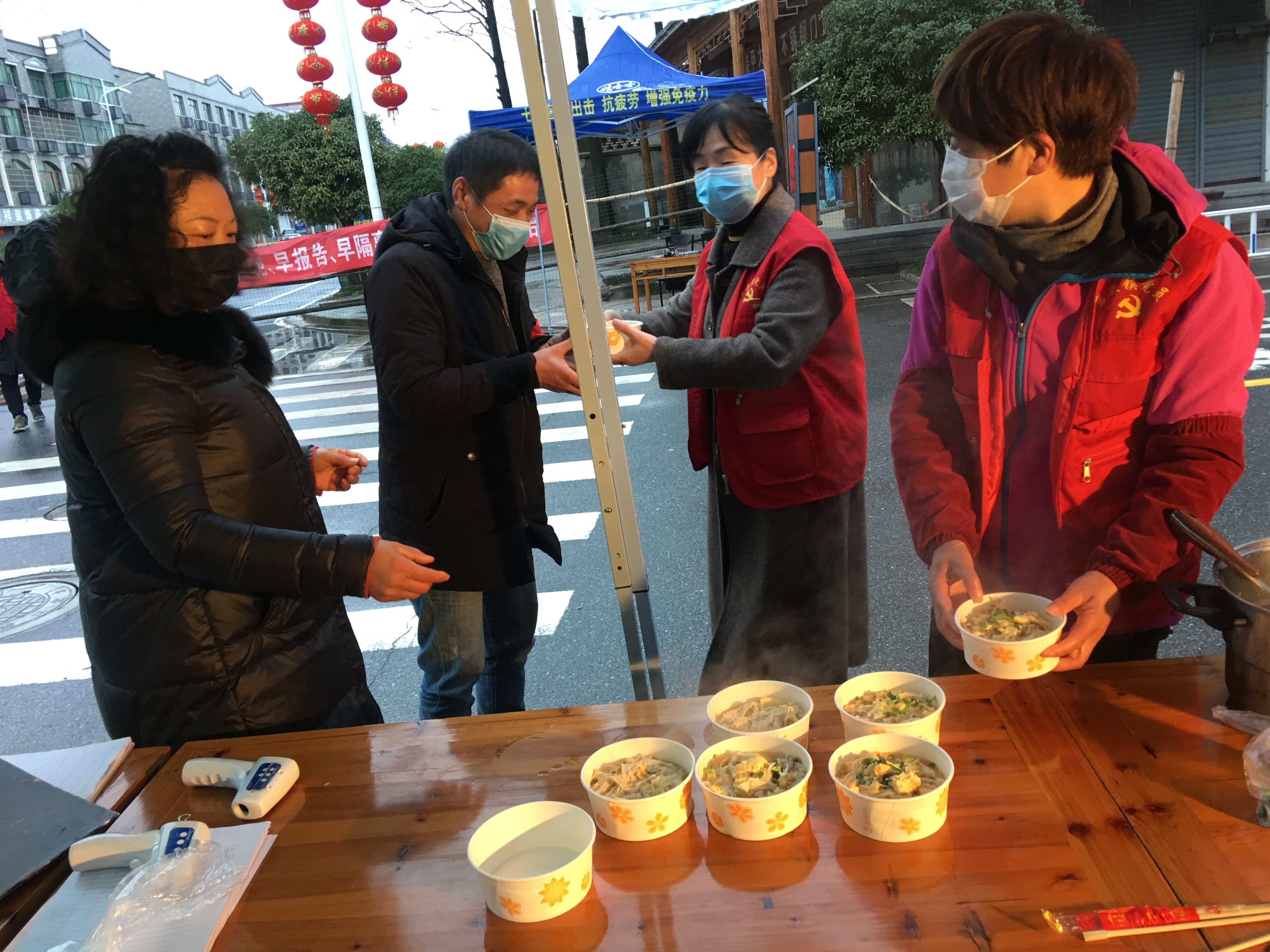 疫情当前,全镇党员干部坚守抗疫一线。为了让一线执勤人员吃顿热乎饭,岩头陈村妇联主席郑丽文和副主席陈红霞自掏腰包,带领村里姐妹组成爱心慰问团,到各个执勤卡点给值班人员送去热腾腾的汤圆、麦饼、小米粥、茶叶蛋等,让一线党员干部暖心又暖胃。
