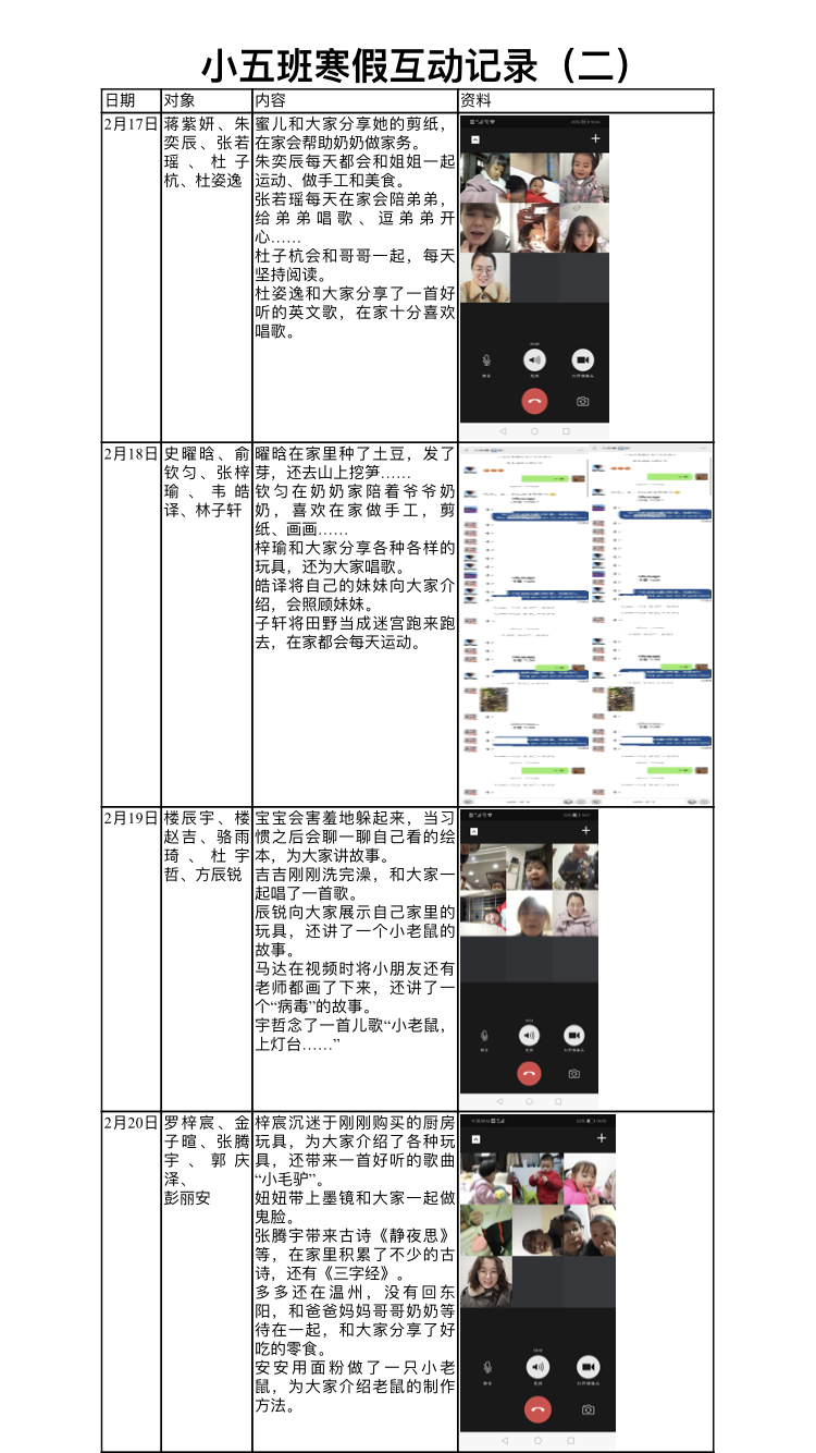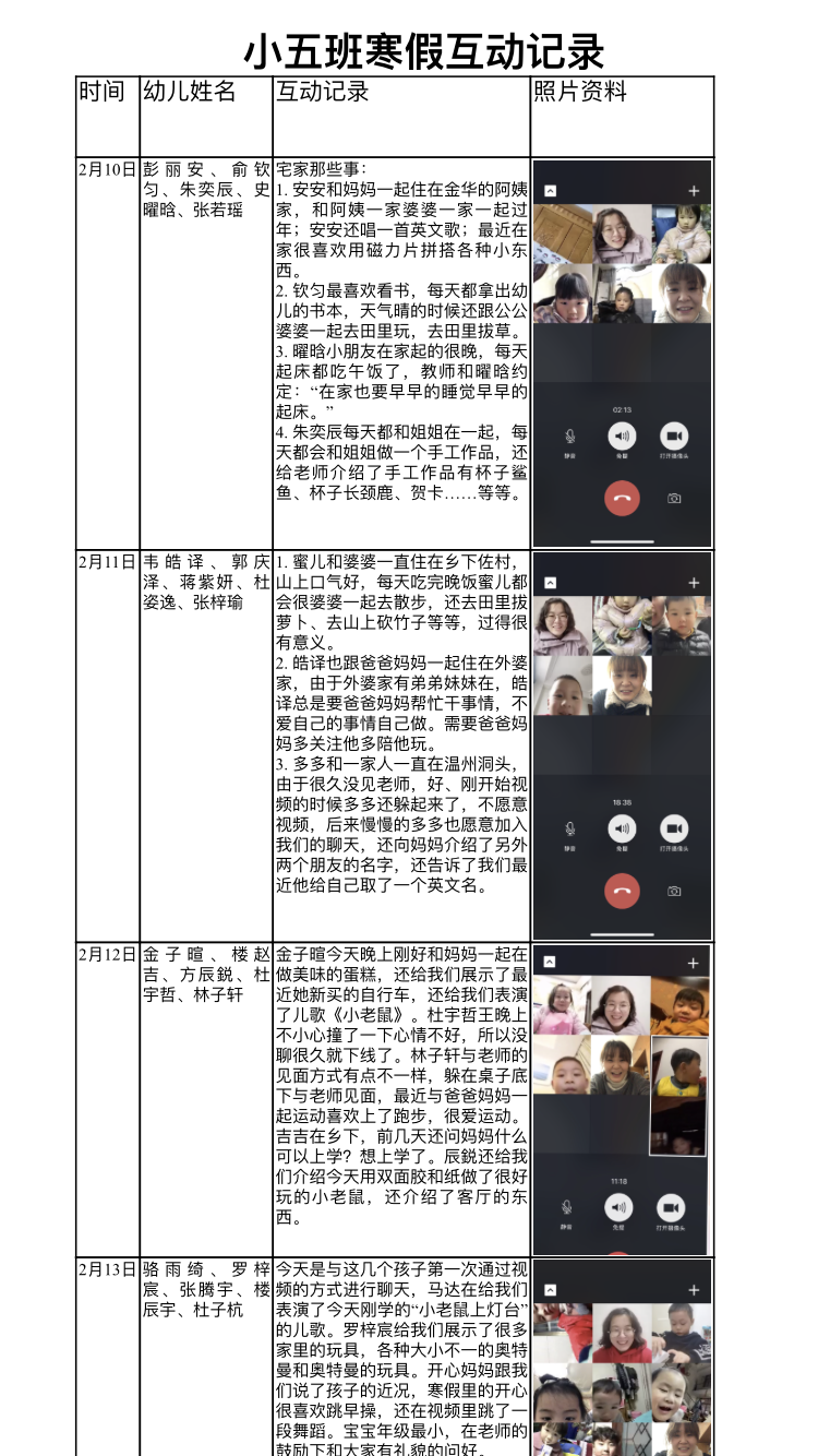 “2月10日,安安和妈妈一起住在金华的阿姨家,和阿姨一家婆婆一家一起过年;安安还唱了一首英文歌;最近她喜欢用磁力片拼搭各种小东西。”“2月12日,金子暄今天晚上刚好和妈妈一起在做美味的蛋糕,还给我们展示了最近新买的自行车,还给我们表演了儿歌《小老鼠》。”……这是该园小(5)班互动记录的内容。