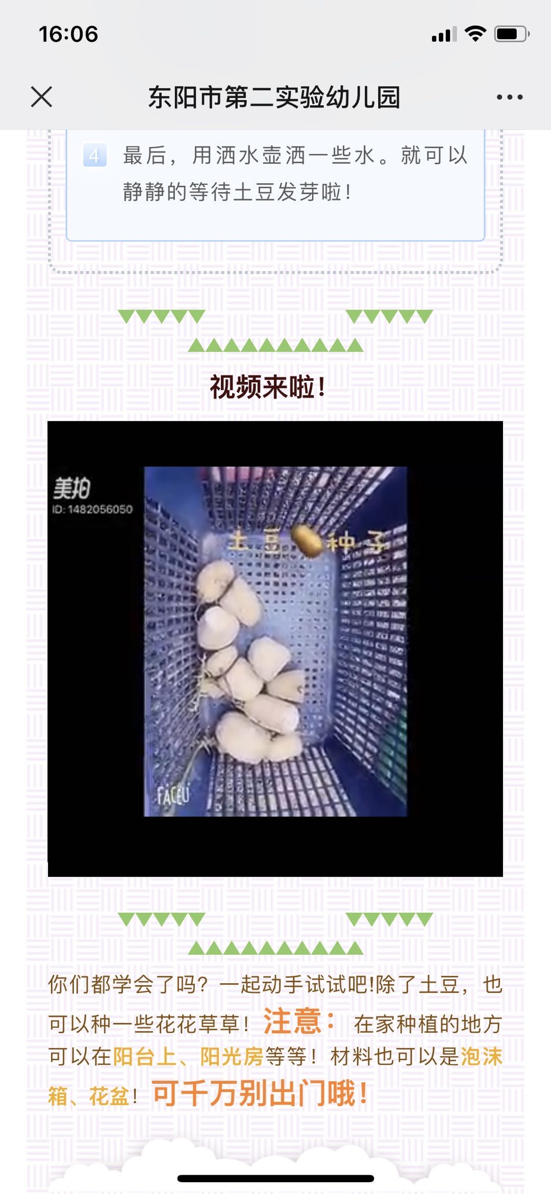 2月25日,微信公众号“东阳市第二实验幼儿园”发布了第30期“芽宝小卫士”,通过视频讲解的方式,向小朋友们介绍土豆的种植方法。