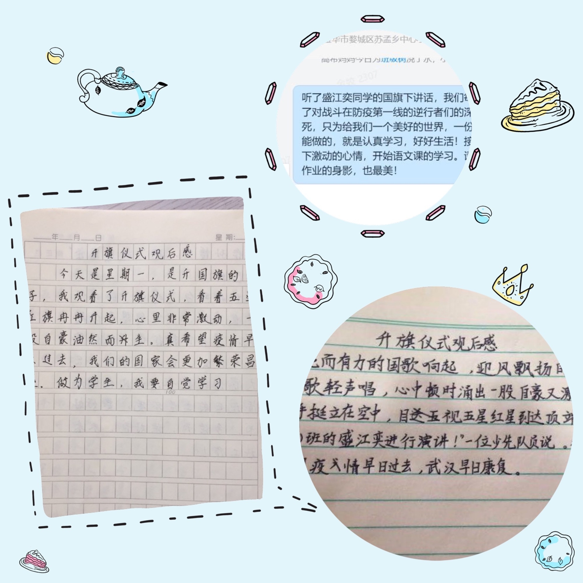 作为首位参与“国旗下讲话”的学生,五(2)班盛江奕写了满满一页名为《你们的样子,最美》的作文。“别人对疫区避而远之,你们却日夜兼程向疫情最严重的地方赶去;别人在家中团圆过节,你们却冒着生命危险24小时执行自己身上的任务。你们的“战斗服”是防护服,你们的“武器”是手术刀、针筒、呼吸机……”在800余字的文章中,盛江奕表达了对最美的逆行者的致敬。