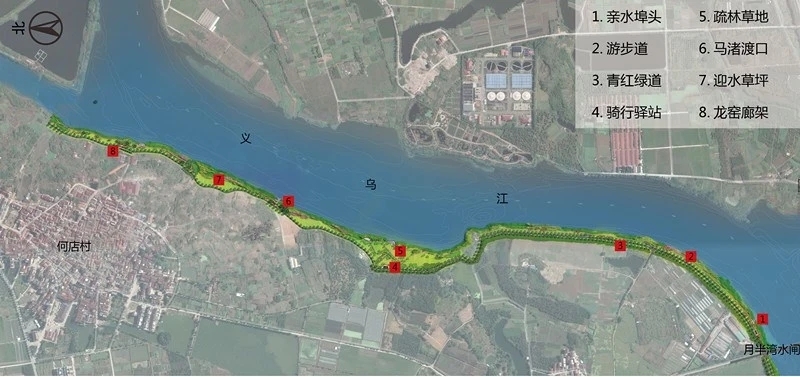 义乌江美丽城防工程(铜溪入江口—半月湾水闸右岸段)河段中心线长2340米。工程采用20年一遇防洪标准,工程总投资3900万元。主要建设内容有:工程治理范围为铜溪入江口至半月湾水闸右岸段,河道中心线长2.403km,新建右岸堤防长度为2.714km,新建沥青道路2.832km,新建游步道1.853km及生态景观绿化等。
