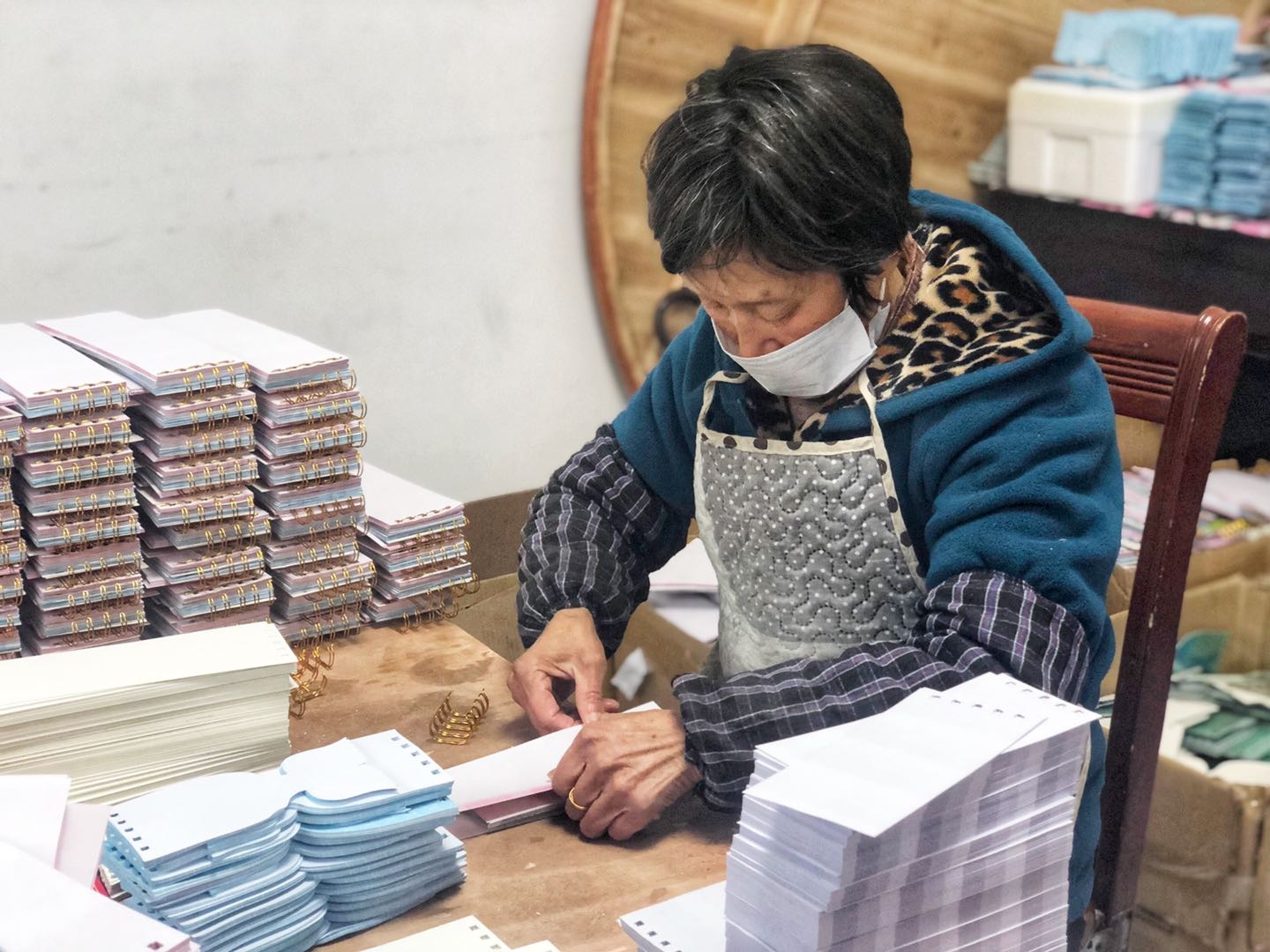 谢金兰说,人员合理分配,大家完成订单的效率提高了,原计划3月底交付的订单,现在已基本完成,做完后马上接手15万册活页本和30万个黑板两个大订单。