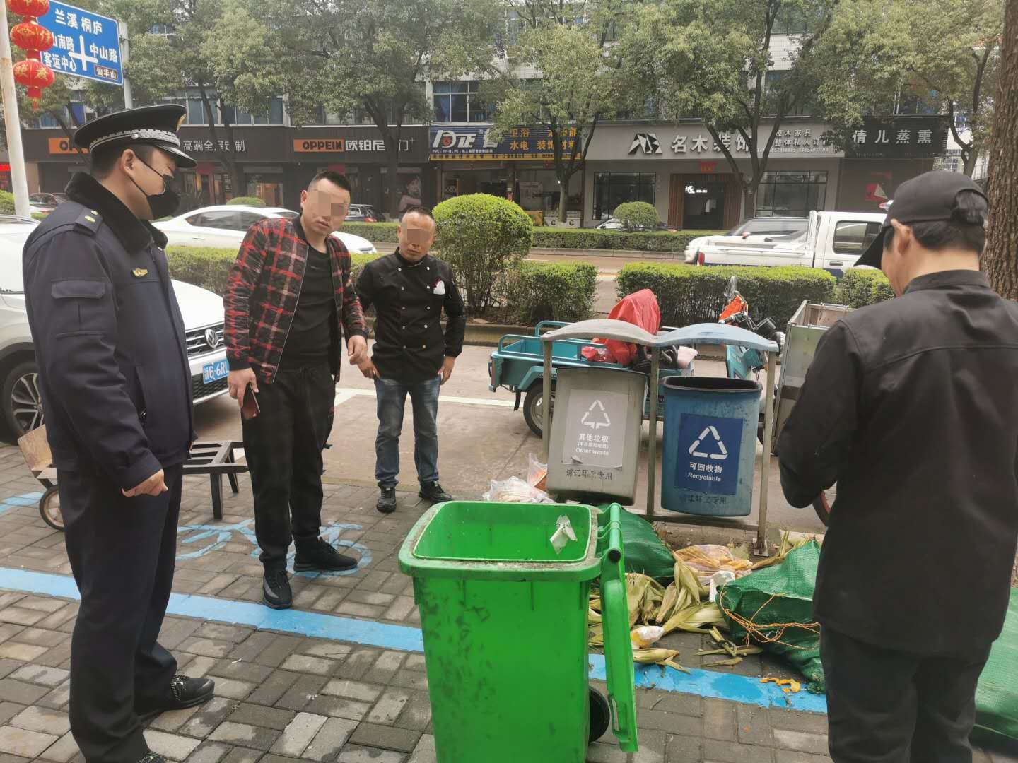 据介绍,3月7日13时许,执法队员巡查至江滨东路时发现,沿街一公共果壳箱旁堆放着生活垃圾。经调查后,确定堆放的垃圾来自街边一家火锅店。