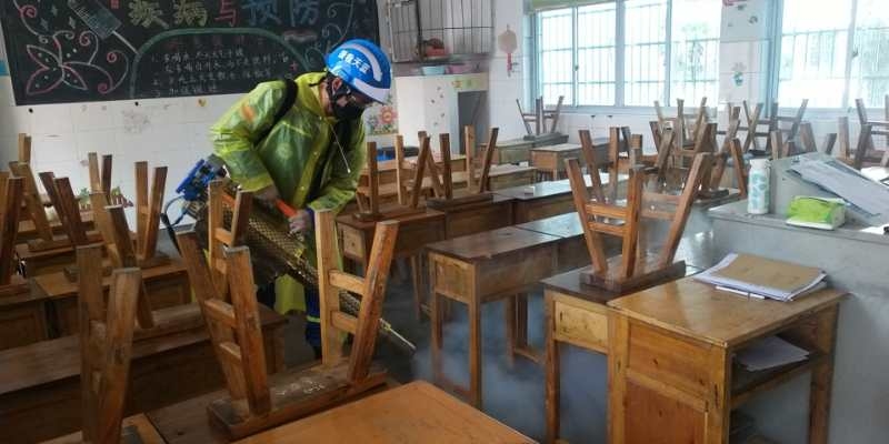 此时,另外几名成员则背着消毒器正在学校的操场、宿舍楼等地做消杀。