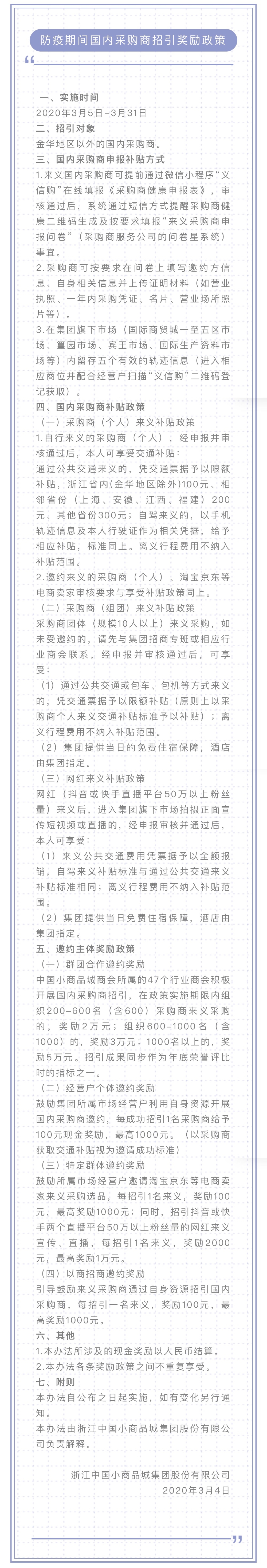 “客人是条龙,不来要受穷。”自义乌市场复市以来,商城集团已相继推出疫情期间关于外籍采购商来义采购的奖励办法以及国内采购商招引奖励政策,对来义的中外采购商提供交通补贴、免食宿以及采购商邀约奖励、外贸服务保障等,最大限度招引中外采购商回流,以进一步激活市场、提振信心。