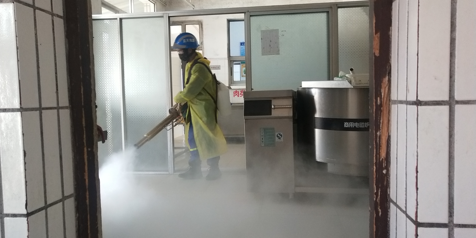 伴着阵阵“嗡嗡”声,一团团白色烟雾喷散而出,细密的消毒液喷雾均匀地洒在每个角落。今天下午,在东阳市下范小学,来自东阳市蓝天救援队的6名成员全副武装,对学校楼道和教学楼做消杀工作。