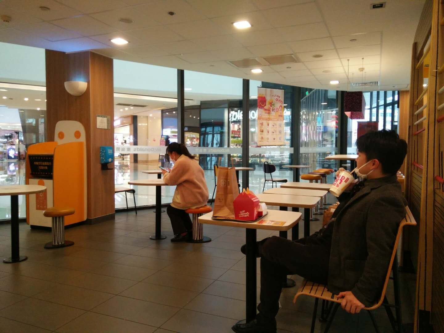 3月9日,浦江人民广场的麦当劳店恢复堂食,虽然顾客不多,但店内还是实行间隔就餐,每桌只能坐一名顾客。“市场监管局的工作指导很到位,提前指导我们做好间隔就餐、场所消毒、查验健康码等工作。”麦当劳一名姓楼的负责人说。