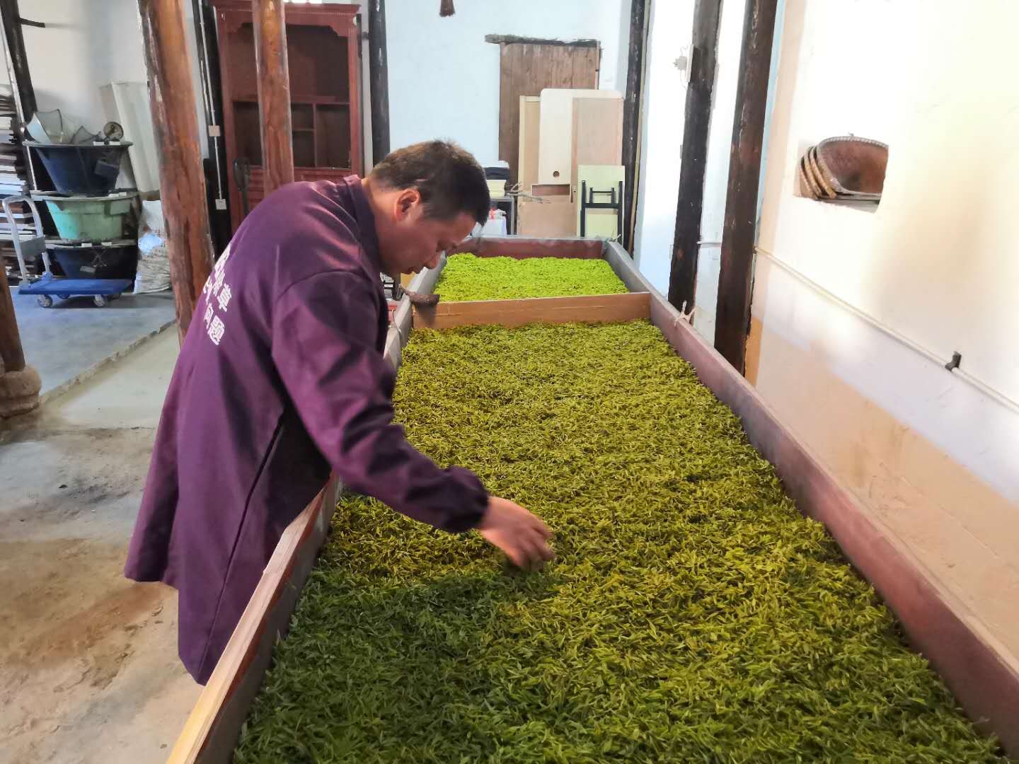 一走进简康家的茶叶加工点,就闻到了一阵茶叶的清香,沁人心脾。茶叶采摘下来后,简康和家里人还要细细挑拣混入其中的老叶、茶叶籽,部分鱼叶,再将茶叶铺开在架子上,在鼓风机和电热丝的作用下让它慢慢失水。在现代化的设备下,这个过程只需要两至三个小时,最后再用家里的制茶设备,进行压扁和烘干两种不同工艺的茶叶加工,部分龙井茶简康自己动手,用手工在锅子里慢慢炒熟,制成手工龙井茶。