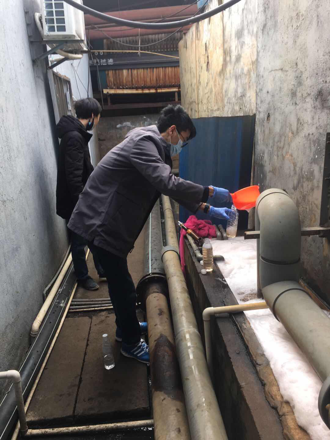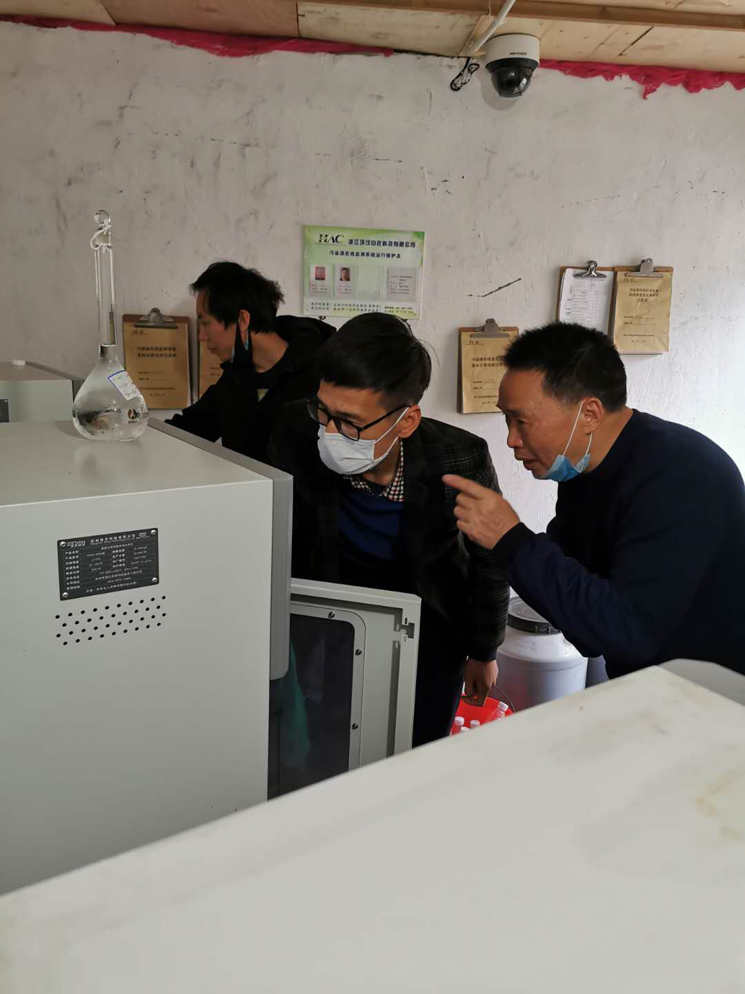 3月19日上午,在东阳市天染针织有限公司里,东阳市环境保护监测站工作人员正在实地查看企业生产情况、日处理水量,检查污水处理设施运行、在线仪器设施运行等情况,并在排污口采取水样,开展污染源监督监测及在线仪器比对监测。