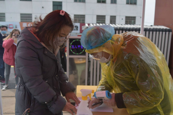演练现场设置东西两个入学检测通道,“学生”们戴好口罩,在校门口按间隔1.5米距离列队,依次进入安全检查通道的同时,用75%消毒酒精对手进行消毒。学校值日老师、校医站在通道卡口负责量体温,详细询问、登记每名学生的信息。当发现“学生”体温异常,由老师第一时间护送至暂留区进行二次测试,如果发现体温仍然异常,立即上报学校疫情防控领导小组并联系家长和医院。
