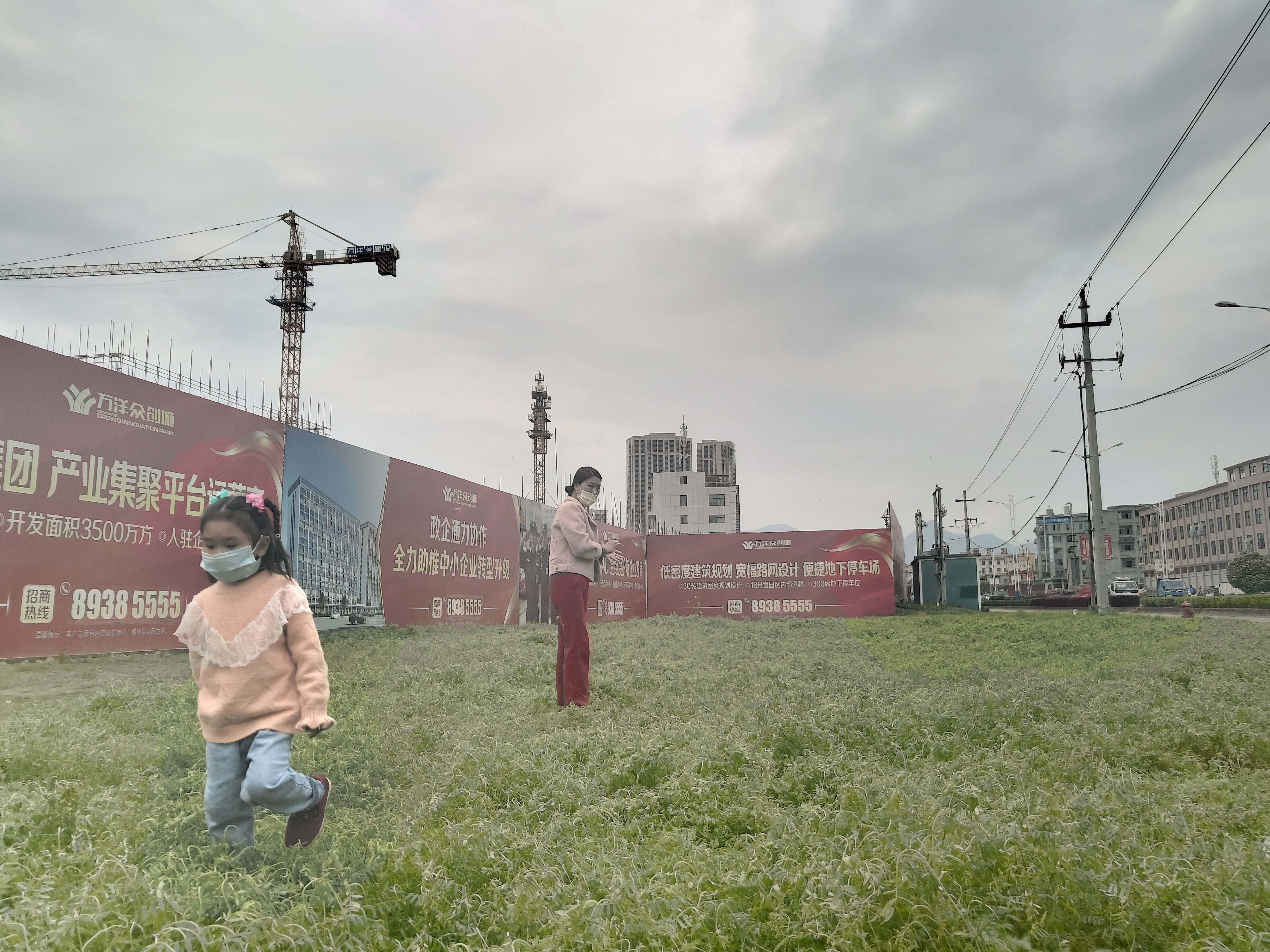 一对母女在绿地上嬉戏,她们的身后是浦江小微企业产业园正在加紧建设。