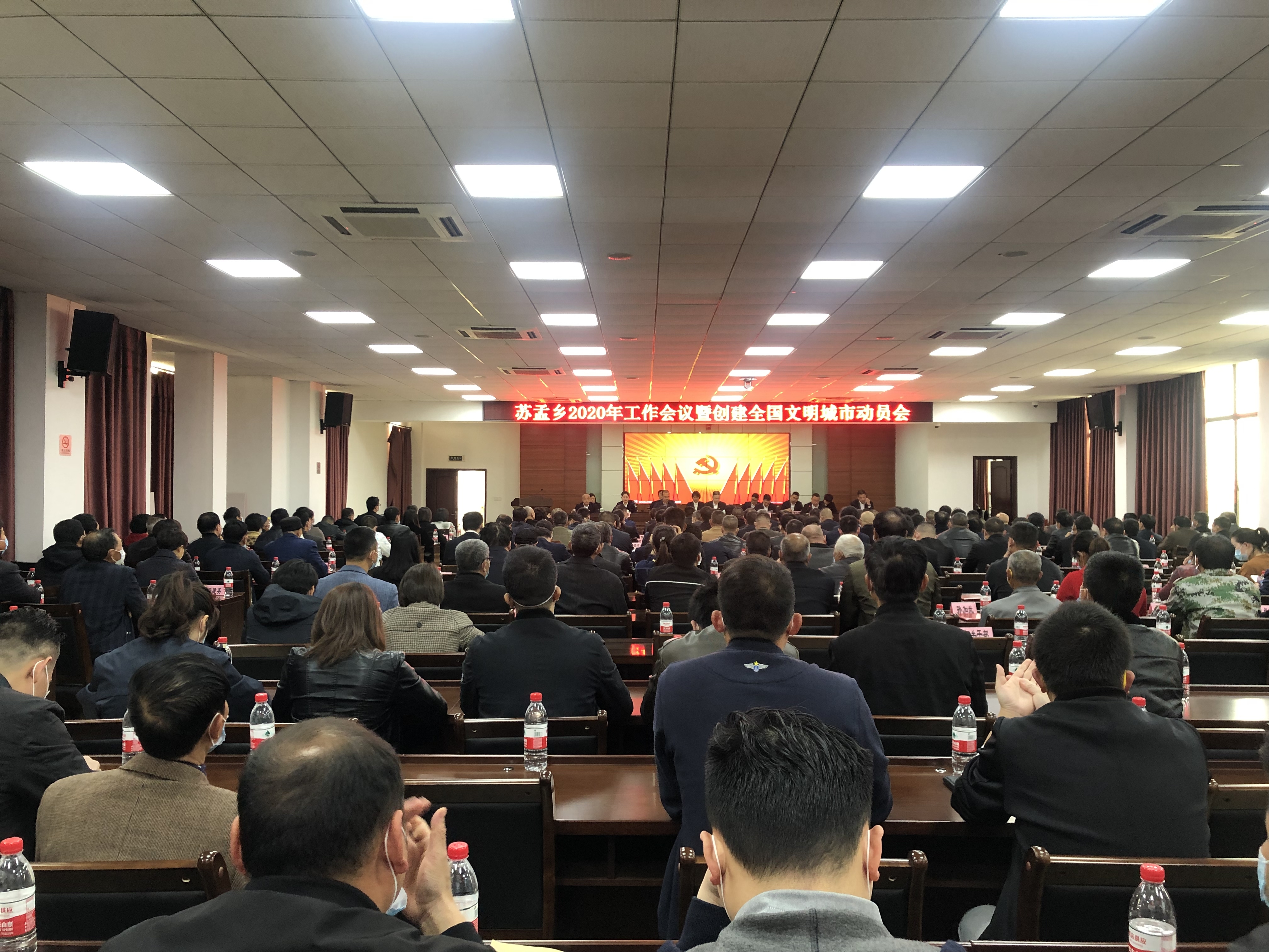 4月13日上午,苏孟乡召开2020年工作会议暨创建全国文明城市动员会。会议强调,全乡上下要进一步凝心聚力,拼搏实干,慎终如始战疫情,只争朝夕抢发展,凝心聚力抓征迁、统筹谋划促融合,力争把苏孟乡全面建成“城乡共融、三产联动、生态宜居”的市区南花园,确保完成2020年目标任务。