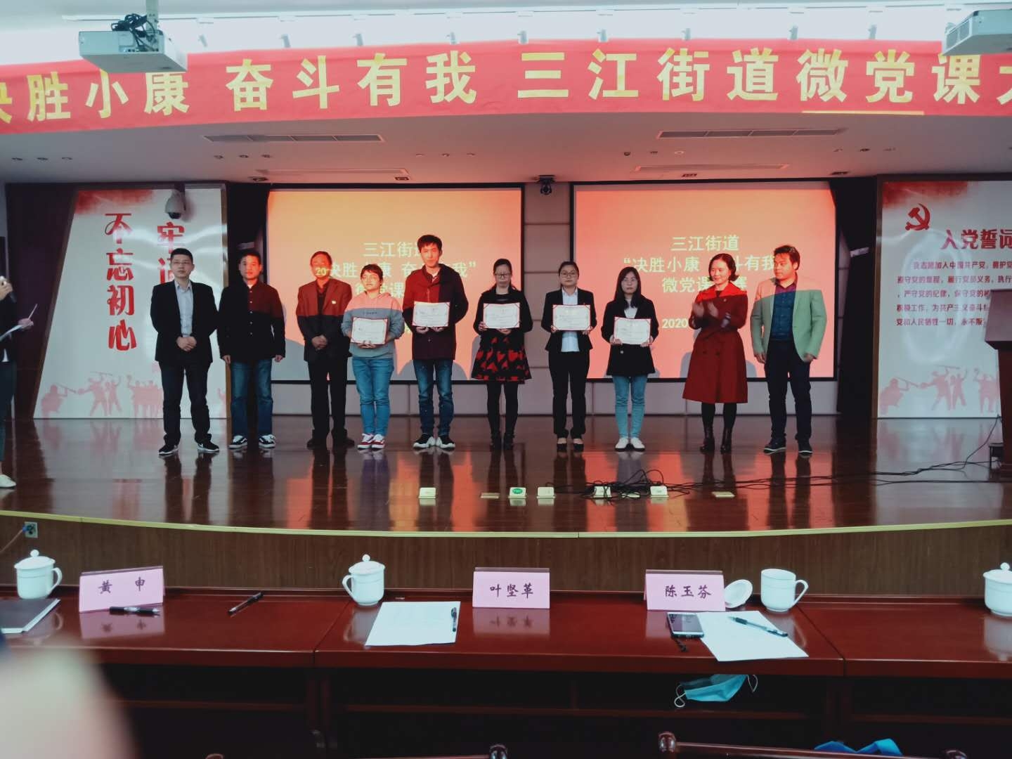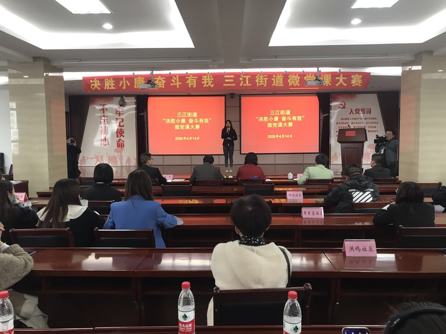 4月14日下午,三江街道举办“决战小康·奋斗有我”微党课大赛。15名参赛选手每人用6分钟时间,讲述为全面小康、疫情防控作出突出贡献的先进典型故事。