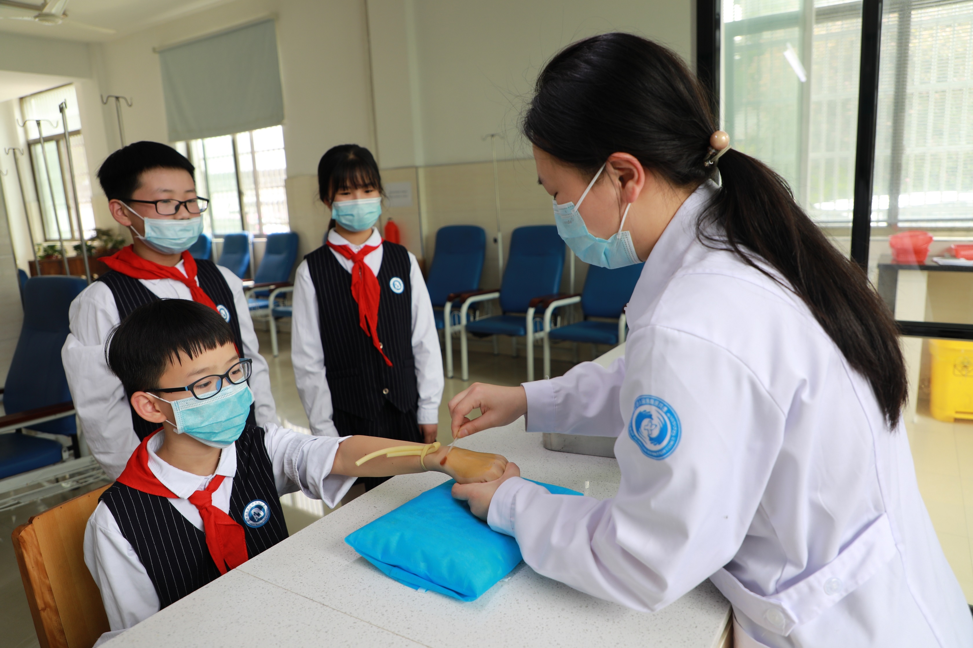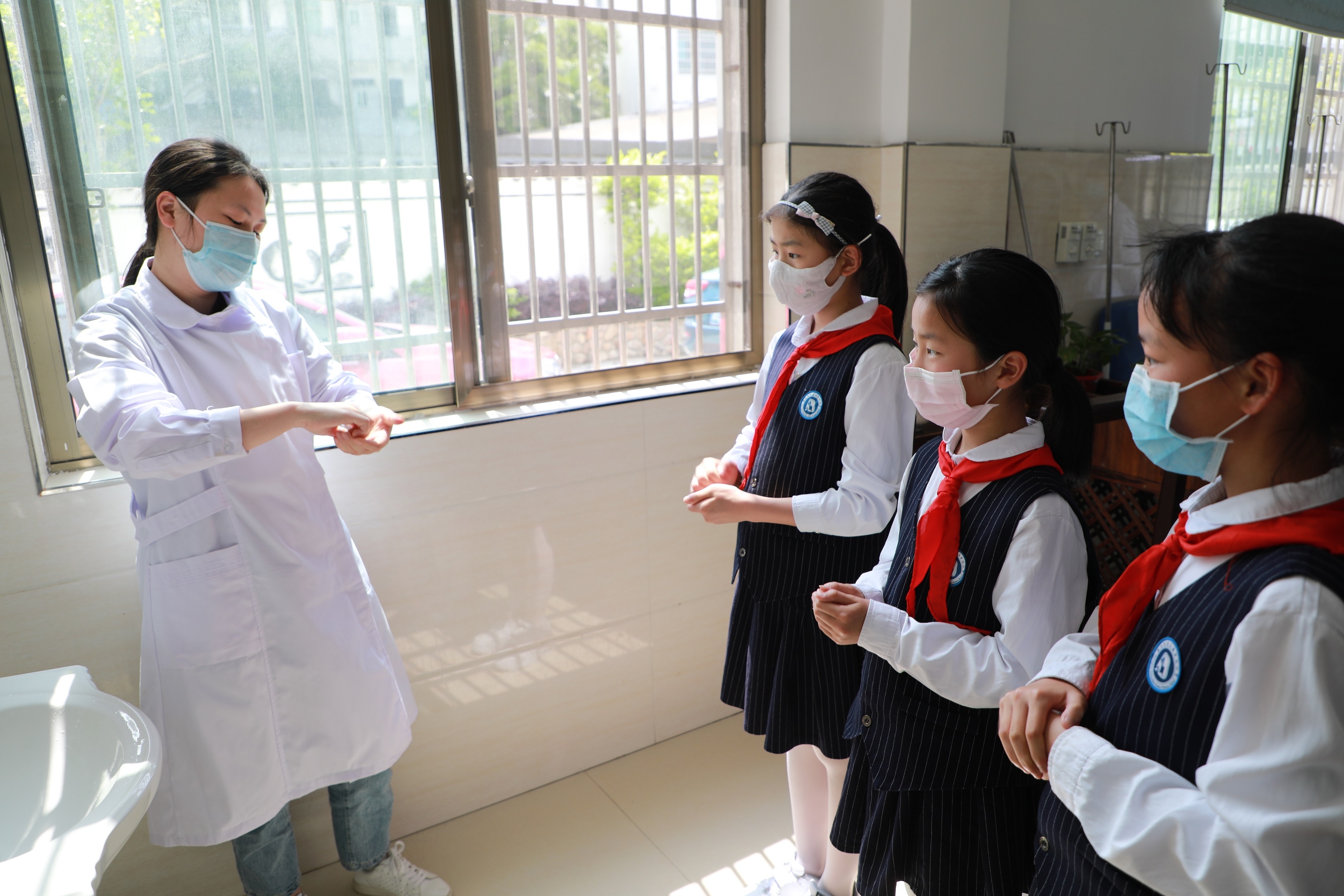 接下来,相关护士给学生们讲解了防疫知识,还通过现场示范等方式,让学生们学会如何“七步洗手法”、口罩的选择及佩戴方法、防范新冠肺炎守则等常用防疫知识。学生们都听得津津有味,纷纷表示回学校后要把这些防疫知识传授给其他同学。