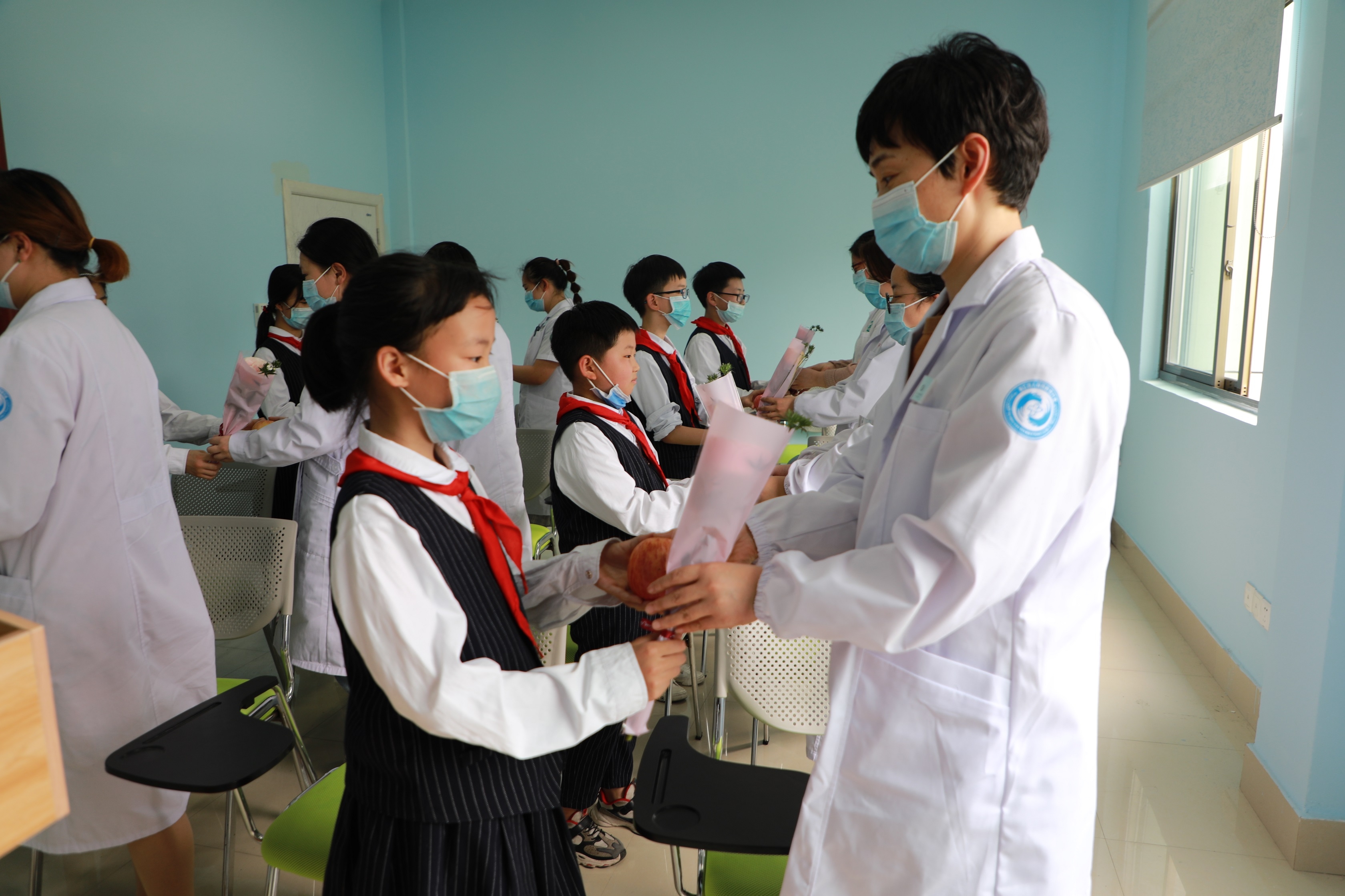 到达卫生院后,学生代表陈一君向护士姐姐们深情并茂地朗读了诗歌《致敬,白衣天使》,向护士姐姐表达敬意。学生们还献上自己精心准备的鲜花和苹果,寓意“美好”“平安”。“谢谢孩子们来看我们。其实,我们做的所有工作是为了让患者舒心、放心、安心。”俞静燕护士长动情地说。