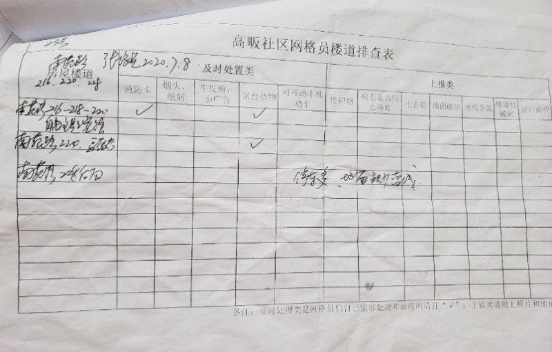 “今天已经检查了11个楼道的卫生情况,文明公益宣传已全部张贴到位,网格内16个门店经检查证照齐全,消防器材已检查完毕,有一个违规充电的需要电工整改。”7月8日,江南街道高畈社区第一网格网格员王颖报送当日网格工作开展情况。