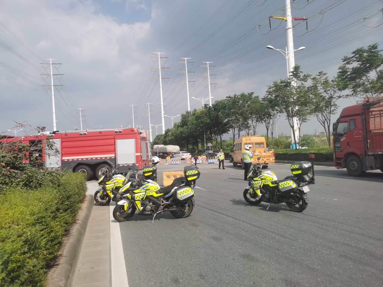 就在这时,一阵由远及近的警笛传来,几辆警用摩托陆续入场。这几位警员与王晨一样,都是金华交警一大队铁骑分队的队员。他们接到警情时正在附近执行巡逻任务,急忙赶来支援,只用了4分钟就到达了现场。一到现场,队员们立即开展疏散工作,很快就将附近的群众和车辆疏散到安全范围以外,并预留出了一条车道供消防车辆使用。