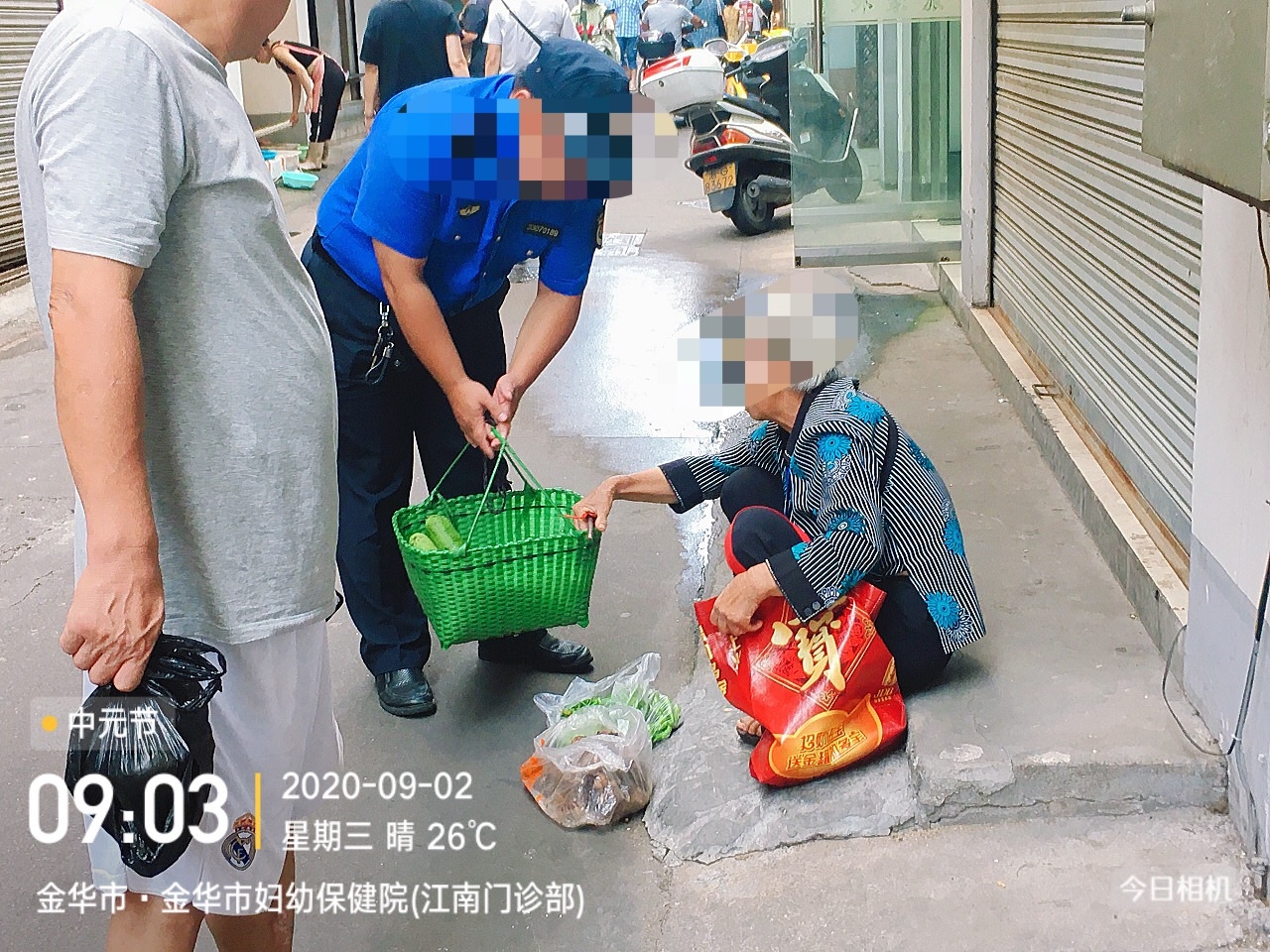 9月2日上午九时许,开发区综合行政执法分局江南中队队员路面巡查至下官桥社区五里牌楼路10弄附近时,看见一位年迈的老奶奶拿着自家的丝瓜、毛芋、辣椒在路边占道贩卖。