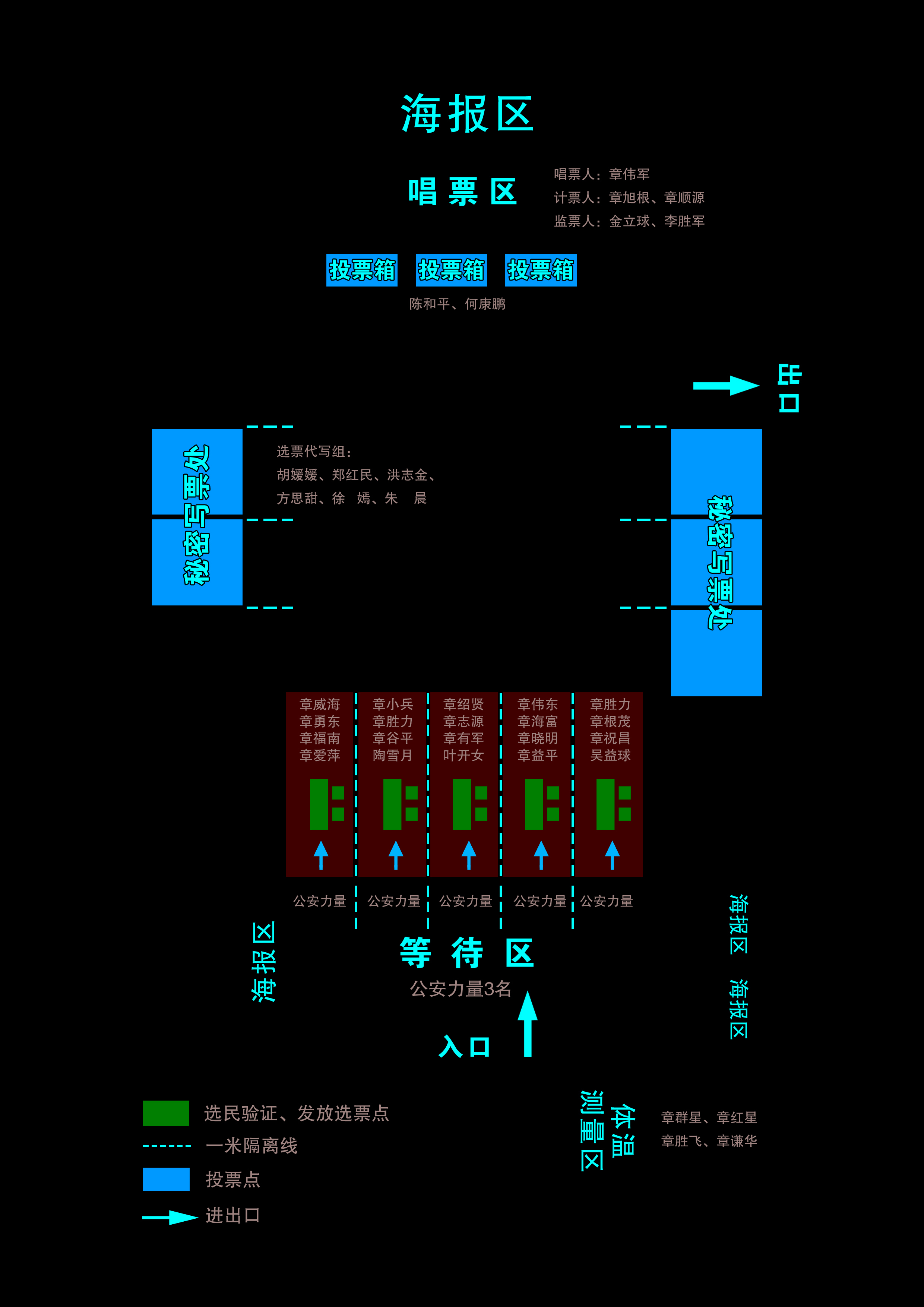 工作现场指挥组由镇党委班子成员组成,镇党委书记、镇长担任总指挥和副总指挥,进行现场坐镇。选举投票现场用隔离带分隔出等候区、验发选票区、投票区、唱计票区等区域,用红色幕布分隔出5处秘密写票点。验发选票组设置于选台入口处,负责组织选民有序排队领票,核对选民信息,在选民证标记后发放选票。选票代写组设置于秘密写票点,引导选民有序进入秘密写票点填写选票,指导选民正确填写选票,遇到年纪较大、不会写字的老年选民可代写选票。唱计票组设置于唱票点,负责对票箱进行查验并封箱签字,在投票完成后逐张检验选票,汇报选票汇总情况,并进行现场唱计票。投票区组设置于村文化礼堂出口处,负责维护投票区秩序,处理投票区突发情况,引导帮助选民把选票投入选票箱,组织选民有序离场。