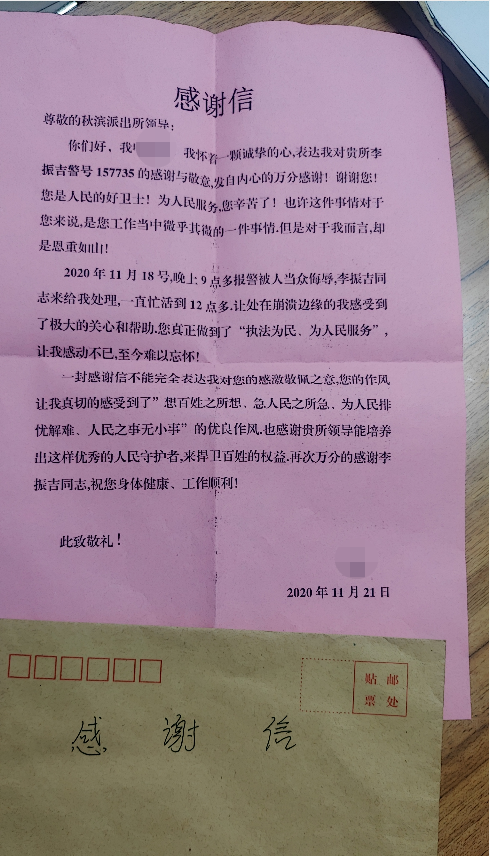 “也许这件事对于您来说,只是工作中一件微乎其微的事情,但是对于我而言却是恩重如山。”11月21日,秋滨派出所副所长李振吉收到的一封感谢信里面这样写到。来信的市民余女士,曾于11月18日到秋滨派出所报警求助,称有人在微信群内对其进行辱骂。