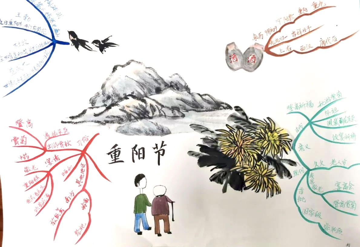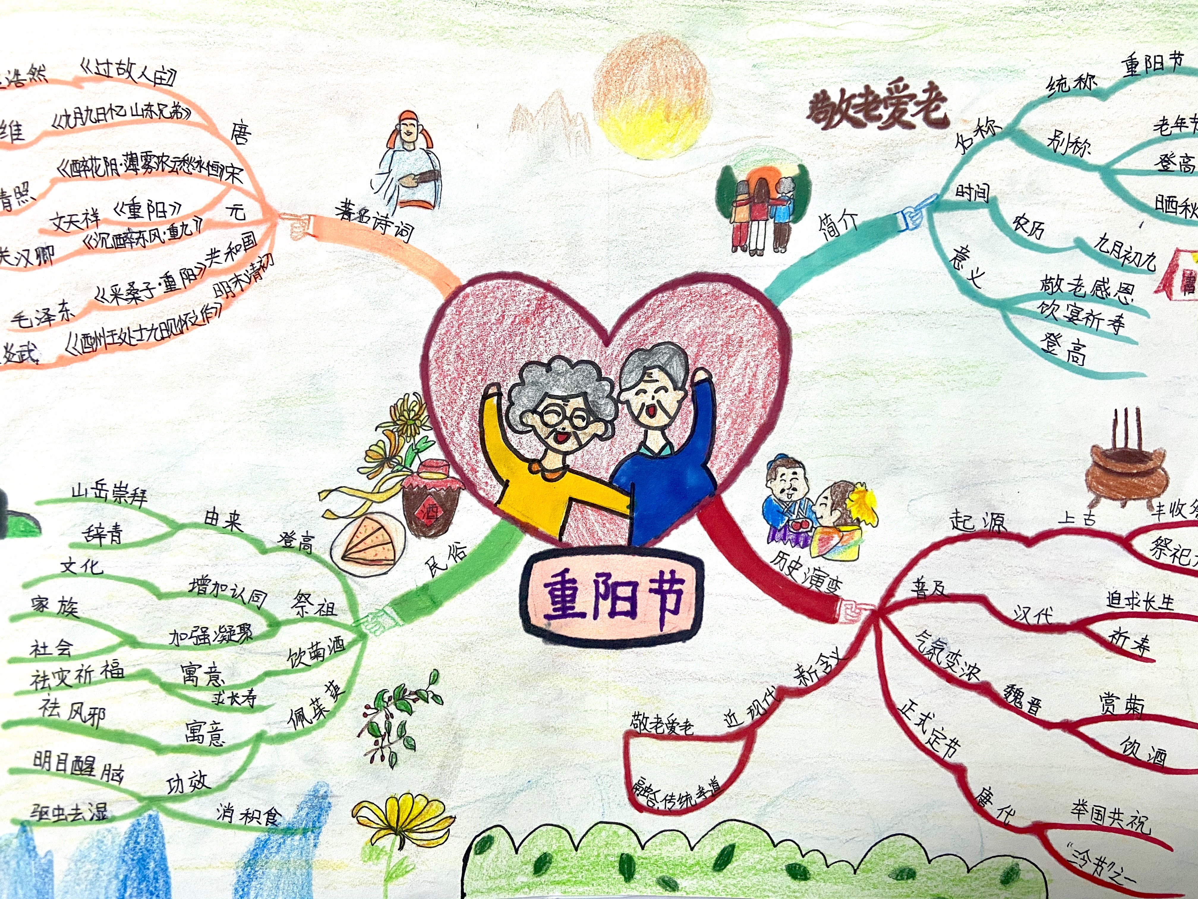 今年,西苑小学开展了思维导图话节日学习活动,每逢传统节日,孩子们就用思维导图进行作画。查找资料、老师指导,一幅幅色彩缤纷的思维导图正式出炉,从重阳节的起源、习俗、美食一直到历代名诗名篇,密密麻麻的文字,惟妙惟肖的笔触,抒发着同学们对中华传统文化的认同与自豪之情。